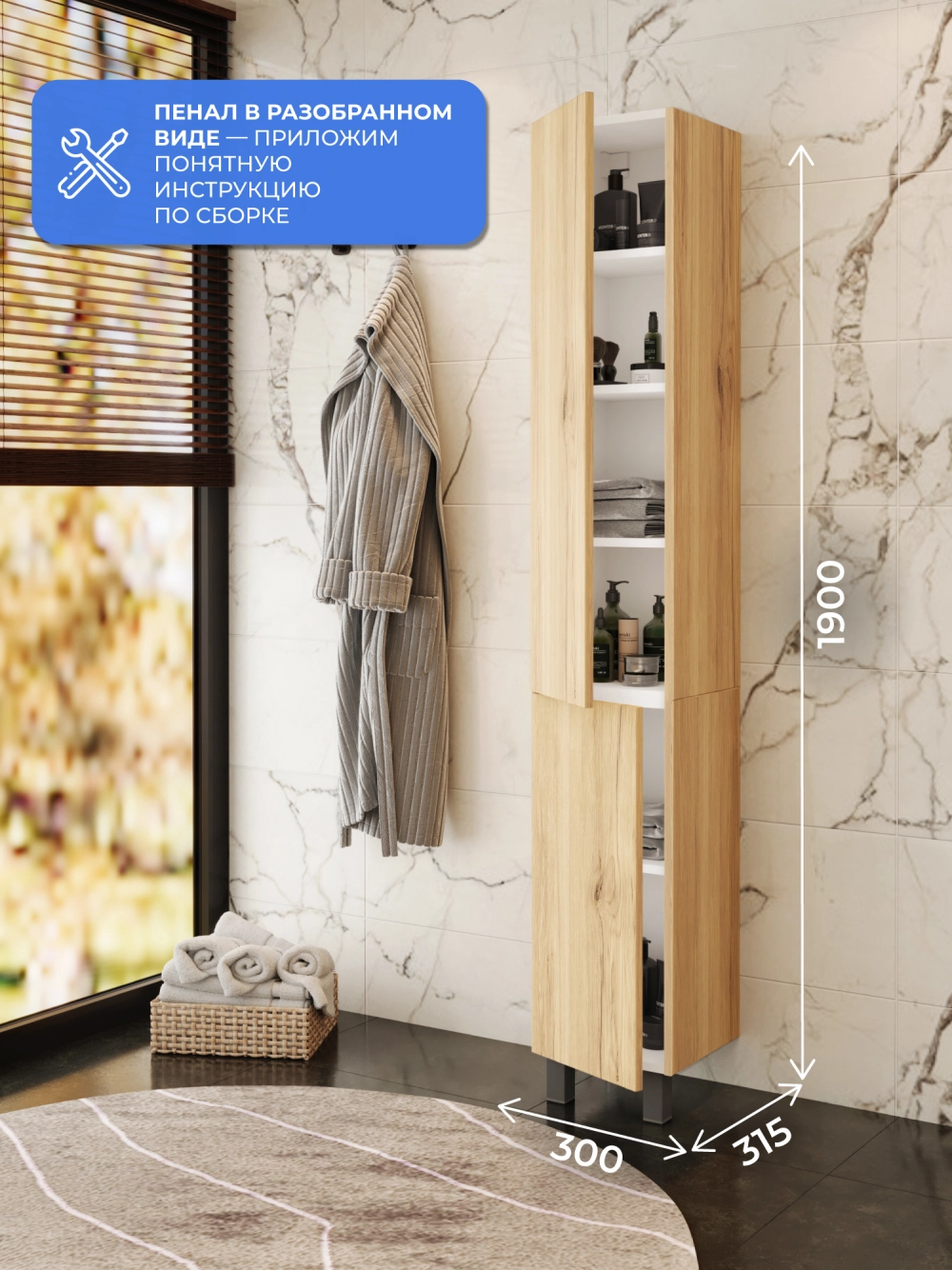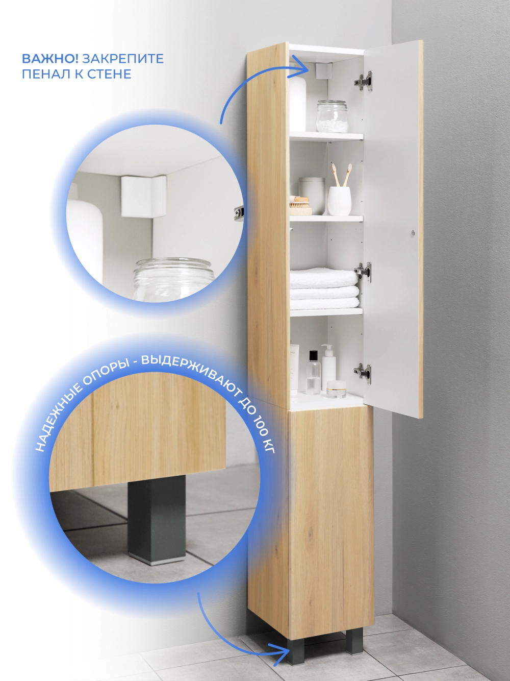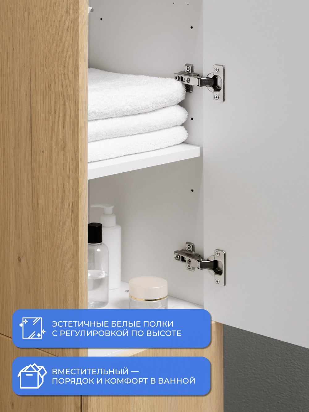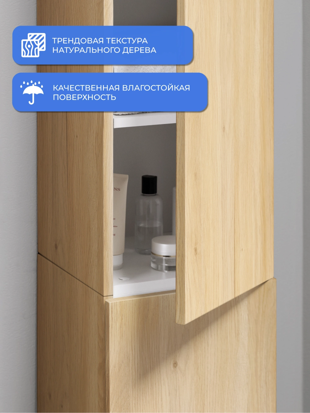 Мебель из коллекции Icon добавит ощущения чистоты и безупречности в современный интерьер ванной комнаты. Изделия выполнены из влагозащищенного МДФ, корпус и фасады покрыты матовой ПВХ-пленкой в цвете Дуб Мавелла Голд. Система push-to-open позволяет открывать дверки простым нажатием на фасад. Главное преимущество системы: отсутствие ручек на фасадах. Идеальные прямые линии, лаконичность, которая восхищает. Такая мебель удовлетворит потребности покупателей в функциональности, но не будет забирать все внимание на себя. Крепления входят в комплект