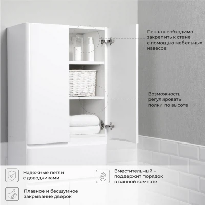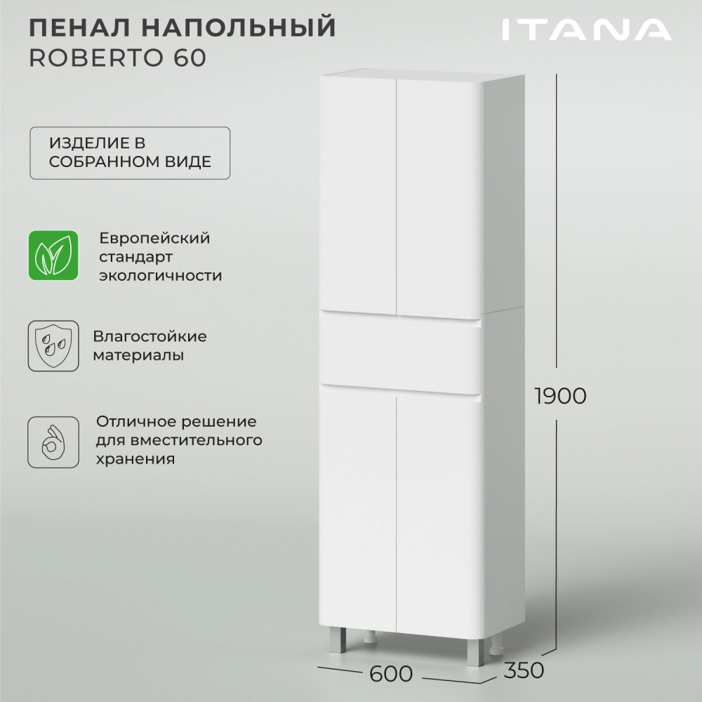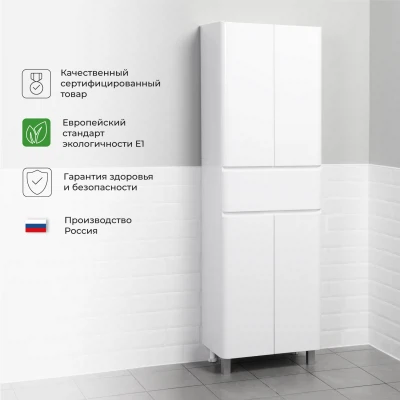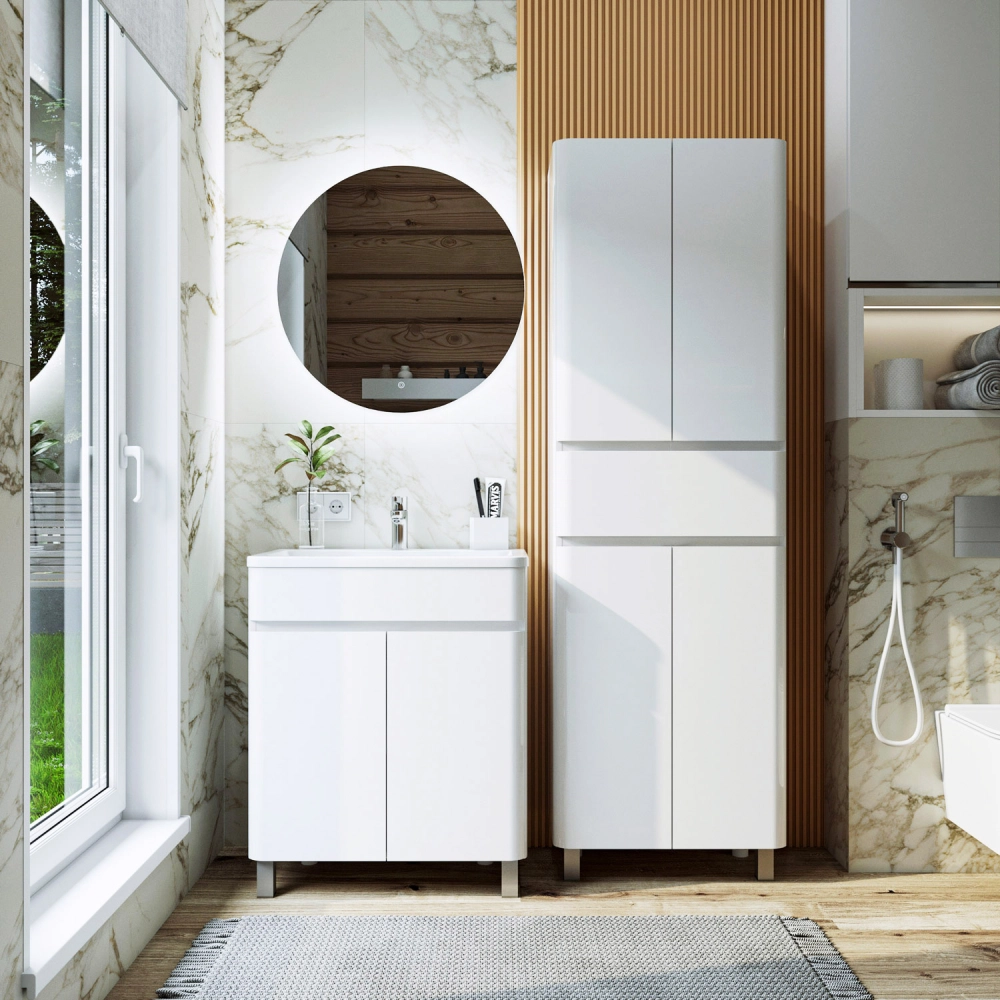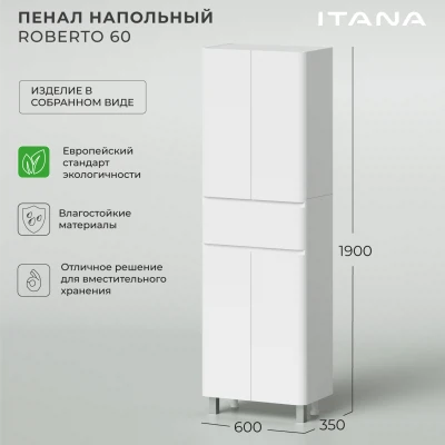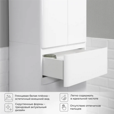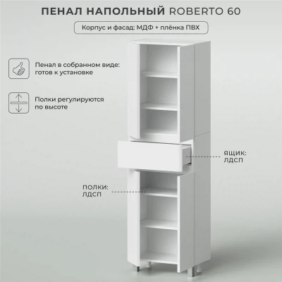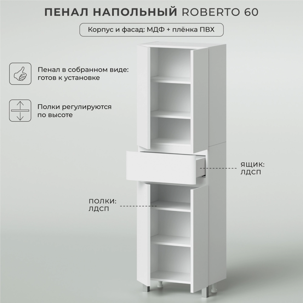 Пенал в ванную из коллекции Roberto 60 в стиле модерн с удобной организацией внутреннего пространства шкафов. Шкаф-пенал поможет создать комфортные условия в ванной комнате. Благодаря его компактным размерам 600х350х1900 он занимает немного места. Пенал в ванную изготовлен из МДФ, что обеспечивает ему привлекательный внешний вид, а также износостойкость и долговечность. Качественная фурнитура с доводчиками обеспечивает легкое открывание и плавное закрывание дверок. Внутри пенала для ванной полки, где можно рационально распределить и разместить все необходимые вещи для ванной комнаты. Полки пенала легко переставить, возможно регулировать расстояние их между собой. Для точного выбора пенала в ванную комнату рекомендуем обратиться к схеме замеров, которая находится на фото в карточке товара. Размеры изделия могут отличаться +/-1 см в связи со спецификой производства. Дополнить комплект можно тумбой с раковиной и зеркалом из коллекции Roberto. Изделия коллекции качественные, функциональные и органически впишутся в популярные и современные интерьерные решения для ванных комнат. Шкаф пенал для ванной комнаты доставляется в предварительно собранном виде, надежно упакован.