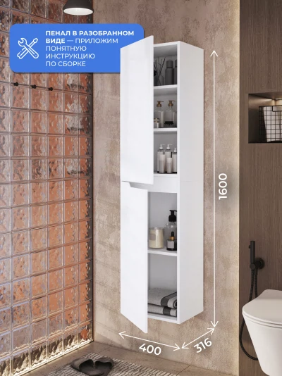 Шкаф пенал в ванную из коллекции Alexa 40 - это сочетание природного декора. Шкаф-пенал поможет создать комфортные условия в ванной комнате. Благодаря его компактным размерам 400х316х1600 и настенному крепежу он занимает немного места и надежно закрепляется. Дверь шкафа для ванной с левосторонним открыванием. Пенал в ванную изготовлен из МДФ и покрыт ПВХ пленкой, что обеспечивает ему привлекательный внешний вид, а также износостойкость и долговечность. Качественная фурнитура с доводчиками обеспечивает легкое открывание и плавное закрывание дверок. Внутри у пенала полки, где можно рационально распределить и разместить все необходимые вещи для ванной комнаты. Полки пенала легко переставить, возможно регулировать расстояние их между собой. Для точного выбора пенала в ванную комнату рекомендуем обратиться к схеме замеров, которая находится на фото в карточке товара. Размеры изделия могут отличаться +/-1 см в связи со спецификой производства. Дополнить комплект можно тумбой с раковиной и зеркалом из коллекции Alexa. Изделия коллекции качественные, функциональные и органически впишутся в популярные и современные интерьерные решения для ванных комнат.