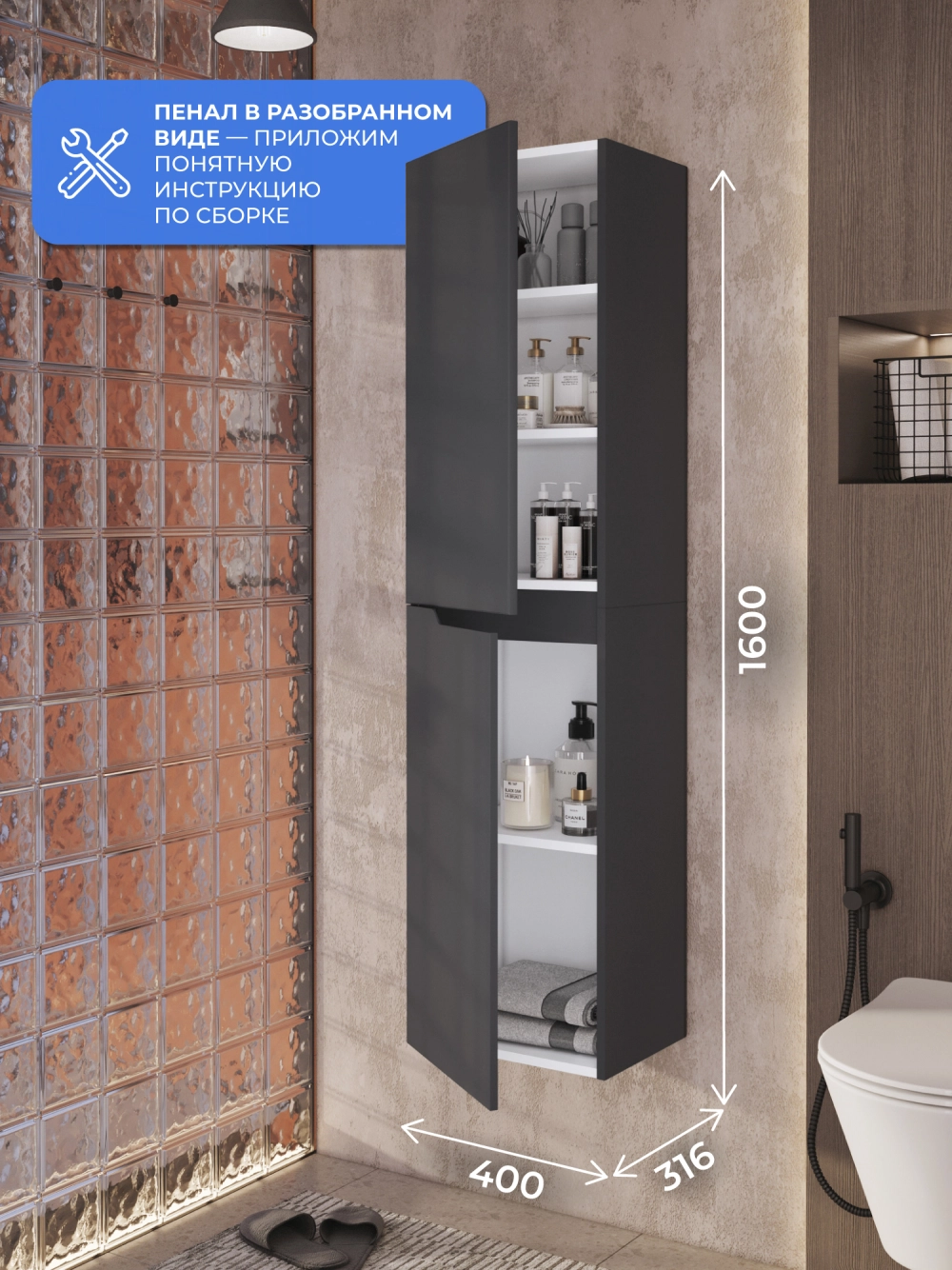Шкаф пенал в ванную из коллекции Alexa 40 - это сочетание природного декора. Шкаф-пенал поможет создать комфортные условия в ванной комнате. Благодаря его компактным размерам 400х316х1600 и настенному крепежу он занимает немного места и надежно закрепляется. Дверь шкафа для ванной с левосторонним открыванием. Пенал в ванную изготовлен из МДФ и покрыт ПВХ пленкой, что обеспечивает ему привлекательный внешний вид, а также износостойкость и долговечность. Качественная фурнитура с доводчиками обеспечивает легкое открывание и плавное закрывание дверок. Внутри у пенала полки, где можно рационально распределить и разместить все необходимые вещи для ванной комнаты. Полки пенала легко переставить, возможно регулировать расстояние их между собой. Для точного выбора пенала в ванную комнату рекомендуем обратиться к схеме замеров, которая находится на фото в карточке товара. Размеры изделия могут отличаться +/-1 см в связи со спецификой производства. Дополнить комплект можно тумбой с раковиной и зеркалом из коллекции Alexa. Изделия коллекции качественные, функциональные и органически впишутся в популярные и современные интерьерные решения для ванных комнат.