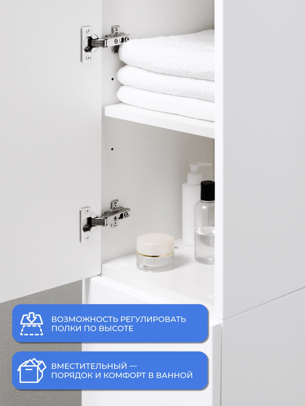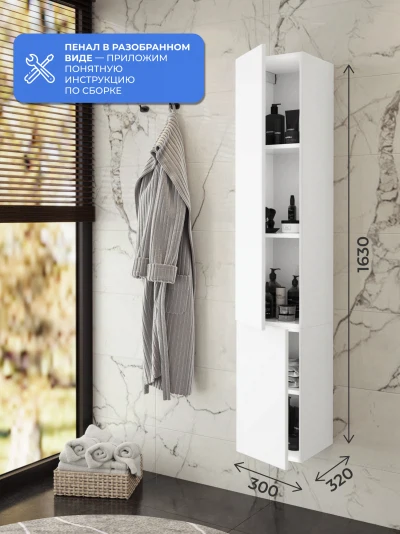 Пенал в ванную из коллекции Icon 30 - это сочетание природного декора. Шкаф-пенал поможет создать комфортные условия в ванной комнате. Благодаря его компактным размерам 300х320х1630 и настенному крепежу он занимает немного места и надежно закрепляется. Дверь шкафа универсальна, возможно установить на любую сторону, как правое, так и левое открывание. Подвесной пенал в ванную изготовлен из влагозащищенного МДФ, корпус и фасады покрыты высокоглянцевой ПВХ-пленкой, что обеспечивает ему привлекательный внешний вид, а также износостойкость и долговечность. Система push-to-open позволяет открывать распашную дверцу простым нажатием на фасад. Главное преимущество системы: отсутствие ручек на фасадах. Внутри шкафа полки, где можно рационально распределить и разместить все необходимые вещи для ванной комнаты. Полки пенала легко переставить, возможно регулировать расстояние их между собой. Для точного выбора пенала в ванную комнату рекомендуем обратиться к схеме замеров, которая находится на фото в карточке товара. Размеры изделия могут отличаться +/-1 см в связи со спецификой производства. Дополнить комплект можно тумбой с раковиной и зеркалом из коллекции Icon. Изделия коллекции качественные, функциональные и органически впишутся в популярные и современные интерьерные решения для ванных комнат.