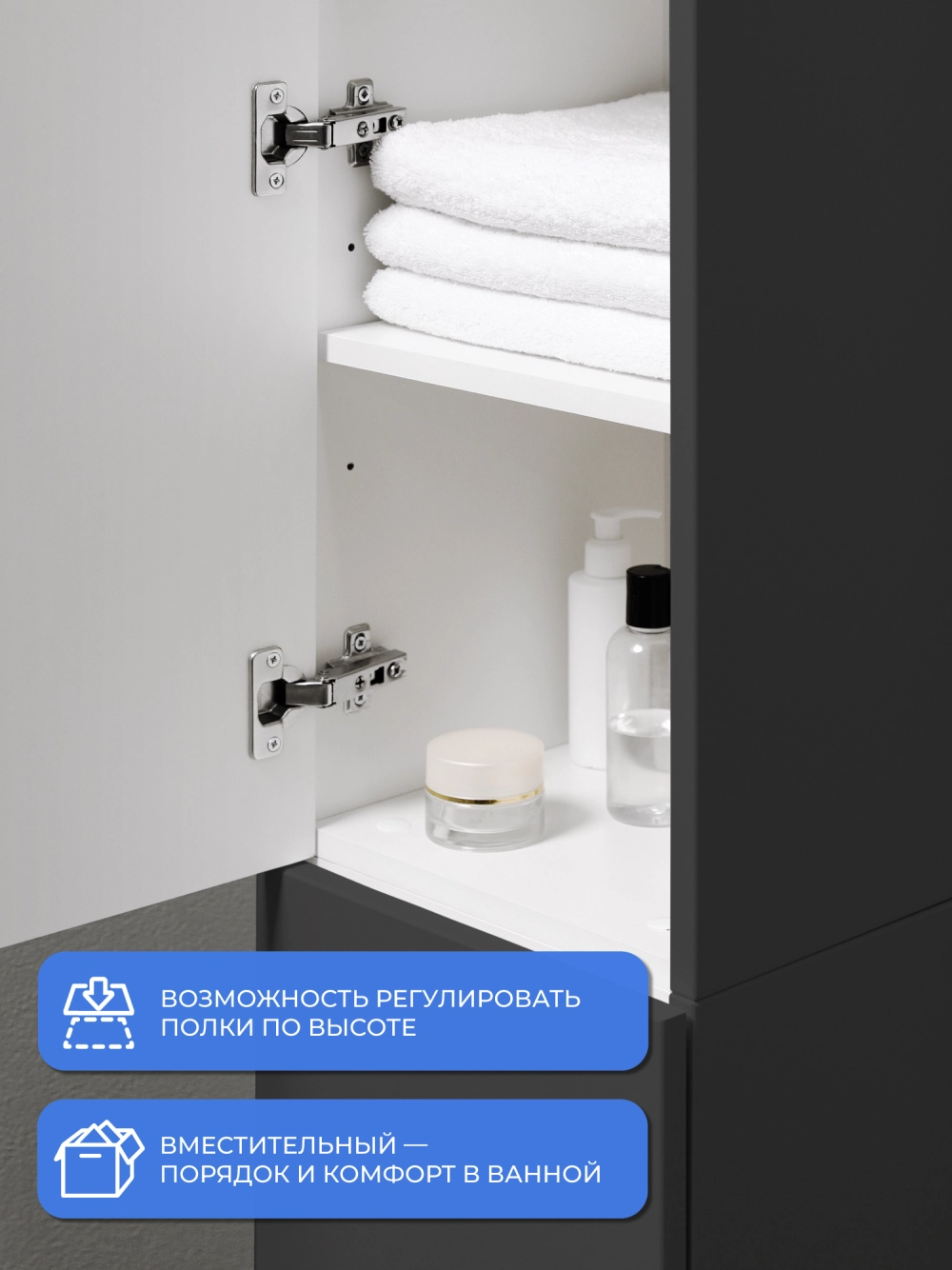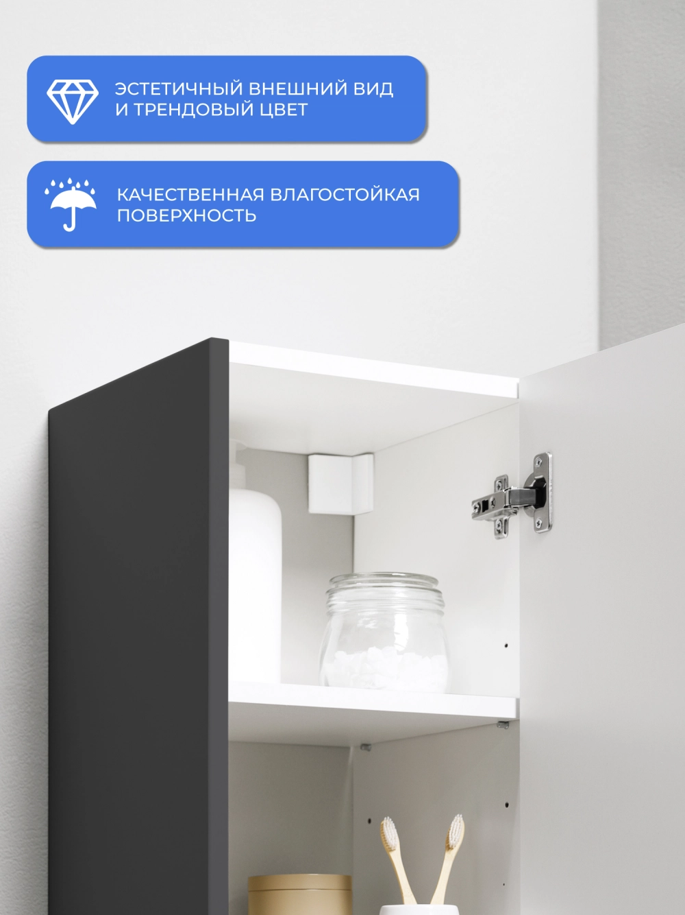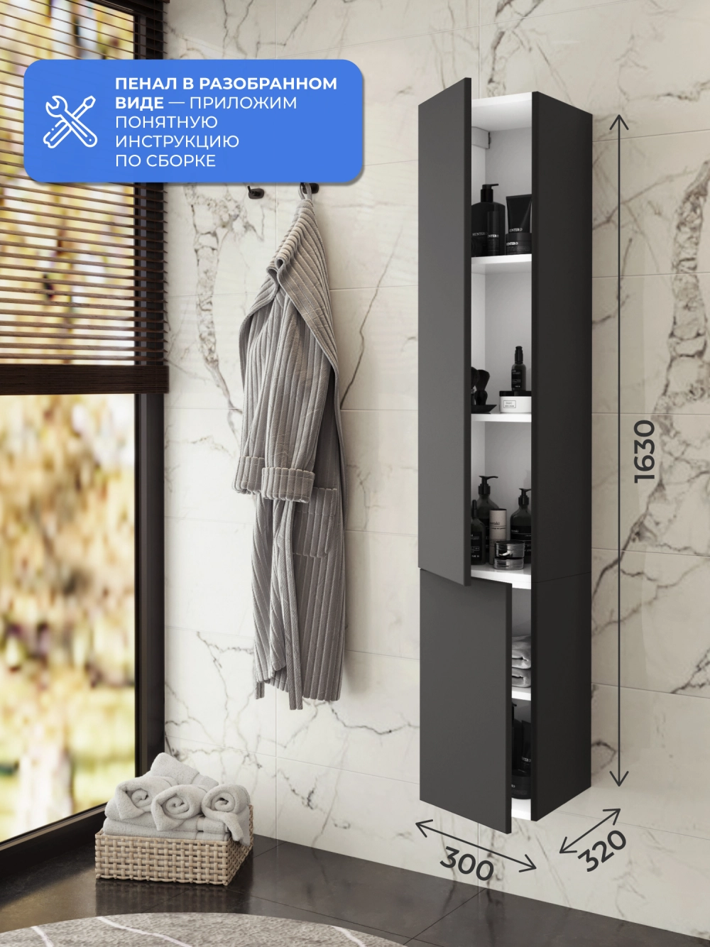 Пенал в ванную из коллекции Icon 30 - это сочетание природного декора. Шкаф-пенал поможет создать комфортные условия в ванной комнате. Благодаря его компактным размерам 300х320х1630 и настенному крепежу он занимает немного места и надежно закрепляется. Дверь шкафа универсальна, возможно установить на любую сторону, как правое, так и левое открывание. Подвесной пенал в ванную изготовлен из влагозащищенного МДФ, корпус и фасады покрыты высокоглянцевой ПВХ-пленкой, что обеспечивает ему привлекательный внешний вид, а также износостойкость и долговечность. Система push-to-open позволяет открывать распашную дверцу простым нажатием на фасад. Главное преимущество системы: отсутствие ручек на фасадах. Внутри шкафа полки, где можно рационально распределить и разместить все необходимые вещи для ванной комнаты. Полки пенала легко переставить, возможно регулировать расстояние их между собой. Для точного выбора пенала в ванную комнату рекомендуем обратиться к схеме замеров, которая находится на фото в карточке товара. Размеры изделия могут отличаться +/-1 см в связи со спецификой производства. Дополнить комплект можно тумбой с раковиной и зеркалом из коллекции Icon. Изделия коллекции качественные, функциональные и органически впишутся в популярные и современные интерьерные решения для ванных комнат.