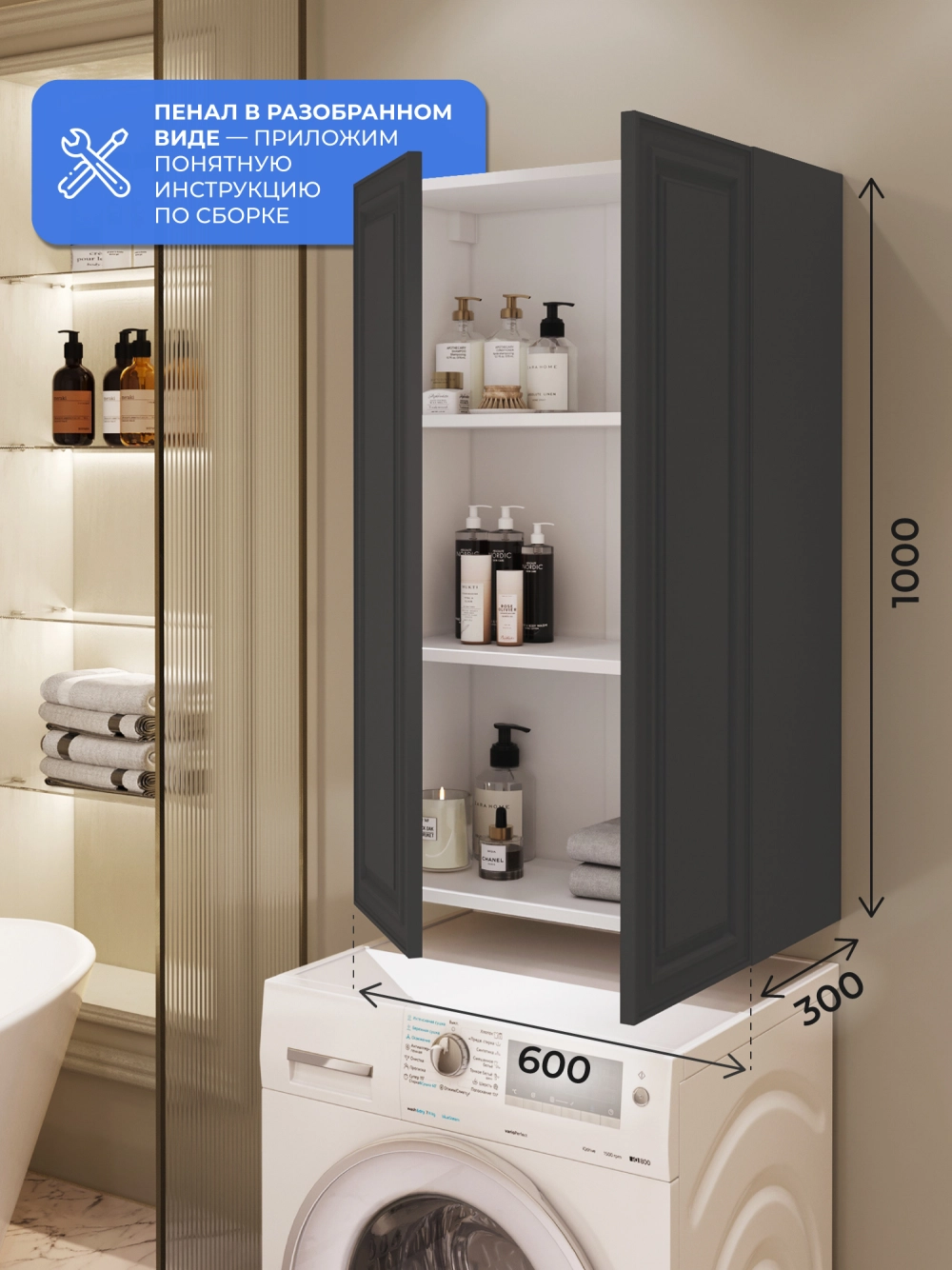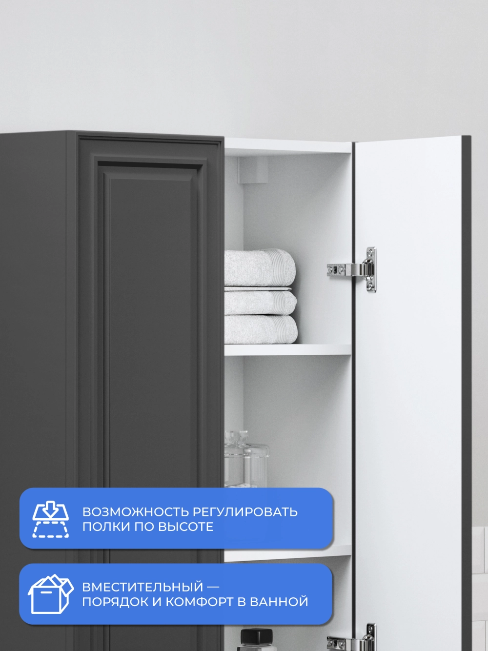 Пенал в ванную из коллекции Verona 60 - это универсальное решение для современной ванной. Шкаф-пенал поможет создать комфортные условия в ванной комнате. Благодаря его компактным размерам 600х300х1000 и настенному крепежу он занимает немного места и надежно закрепляется. Пенал в ванную изготовлен из МДФ и покрыт ПВХ пленкой, что обеспечивает ему привлекательный внешний вид, а также износостойкость и долговечность. Качественная фурнитура с доводчиками и фрезерованные ручки обеспечивают легкое открывание и плавное закрывание дверок. Внутри пенала для ванной полки, где можно рационально распределить и разместить все необходимые вещи для ванной комнаты. Полки пенала легко переставить, возможно регулировать расстояние их между собой. Для точного выбора пенала в ванную комнату рекомендуем обратиться к схеме замеров, которая находится на фото в карточке товара. Размеры изделия могут отличаться +/-1 см в связи со спецификой производства. Дополнить комплект можно тумбой с раковиной и зеркалом из коллекции Verona. Изделия коллекции качественные, функциональные и органически впишутся в популярные и современные интерьерные решения для ванных комнат.