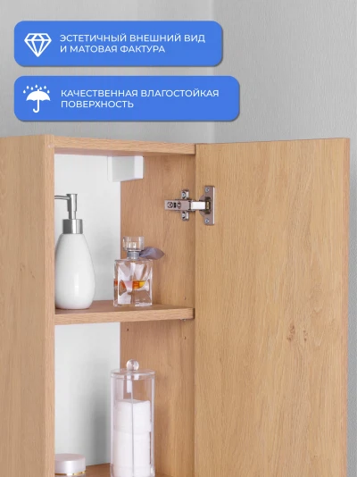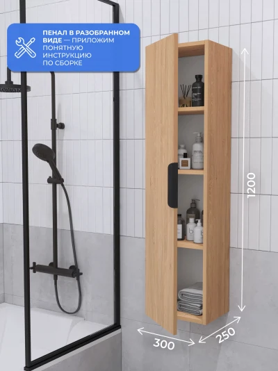 Пенал в ванную из коллекции Alta 30 - это сочетание природного декора. Шкаф-пенал поможет создать комфортные условия в ванной комнате. Благодаря его компактным размерам 300х250х1200 и настенному крепежу он занимает немного места и надежно закрепляется. Дверь шкафа универсальна, возможно установить на любую сторону, как правое, так и левое открывание. Шкаф для ванной изготовлен из ламинированного ДСП, поэтому выдерживает высокие эксплуатационные нагрузки. Качественная фурнитура с доводчиками обеспечивает легкое открывание и плавное закрывание дверок. Внутри шкафа полки, где можно рационально распределить и разместить все необходимые вещи для ванной комнаты. Полки пенала легко переставить, возможно регулировать расстояние их между собой. Для точного выбора пенала в ванную комнату рекомендуем обратиться к схеме замеров, которая находится на фото в карточке товара. Размеры изделия могут отличаться +/-1 см в связи со спецификой производства. Дополнить комплект можно тумбой с раковиной и зеркалом из коллекции Alta. Изделия коллекции качественные, функциональные и органически впишутся в популярные и современные интерьерные решения для ванных комнат.