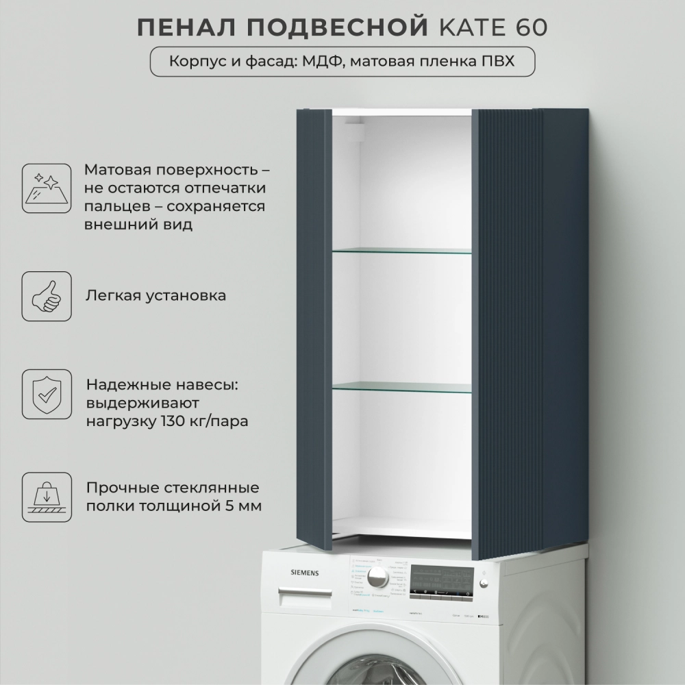 Пенал в ванную из коллекции Kate 60 - воплотил в себе тренд на фактурные фасады. Идеальный "рубчик" - простое и стильное дизайнерское решение для декорирования фасадов - этот пенал бесспорно станет украшением современной ванной комнаты. Благодаря его компактным размерам 600х300х1000 и настенному крепежу он занимает немного места и надежно закрепляется. Пенал в ванную изготовлен из МДФ и покрыт ПВХ пленкой, что обеспечивает ему привлекательный внешний вид, а также износостойкость и долговечность. Качественная фурнитура с доводчиками обеспечивает легкое открывание и плавное закрывание дверок. Внутри у шкафа полки, где можно рационально распределить и разместить все необходимые вещи для ванной комнаты. Полки пенала легко переставить, возможно регулировать расстояние их между собой. Для точного выбора пенала в ванную комнату рекомендуем обратиться к схеме замеров, которая находится на фото в карточке товара. Размеры изделия могут отличаться +/-1 см в связи со спецификой производства. Дополнить комплект можно тумбой с раковиной и зеркалом из коллекции Kate. Изделия коллекции качественные, функциональные и органически впишутся в популярные и современные интерьерные решения для ванных комнат. Шкаф пенал для ванной комнаты доставляется в предварительно собранном виде, надежно упакован.