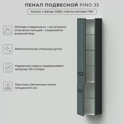 Пенал в ванную из коллекции Pino 35 - это коллекция в стиле нео-классика украсит современную ванную комнату. Шкаф-пенал поможет создать комфортные условия. Благодаря его компактным размерам 350х300х1750 и настенному крепежу он занимает немного места и надежно закрепляется. Дверь шкафа для ванной с левосторонним открыванием. Пенал в ванную изготовлен из МДФ и покрыт ПВХ пленкой, что обеспечивает ему привлекательный внешний вид, а также износостойкость и долговечность. Качественная фурнитура с доводчиками обеспечивает легкое открывание и плавное закрывание дверок. Дизайнерские металлические ручки с покрытием не только декоративный элемент, но и удобное решение, фасады остаются чистыми при постоянном открывании и закрывании. Внутри пенала для ванной полки, где можно рационально распределить и разместить все необходимые вещи для ванной комнаты. Для точного выбора пенала в ванную комнату рекомендуем обратиться к схеме замеров, которая находится на фото в карточке товара. Размеры изделия могут отличаться +/-1 см в связи со спецификой производства. Дополнить комплект можно тумбой с раковиной и зеркалом из коллекции Pino. Изделия коллекции качественные, функциональные и органически впишутся в популярные и современные интерьерные решения для ванных комнат. Шкаф пенал для ванной комнаты доставляется в предварительно собранном виде, надежно упакован.