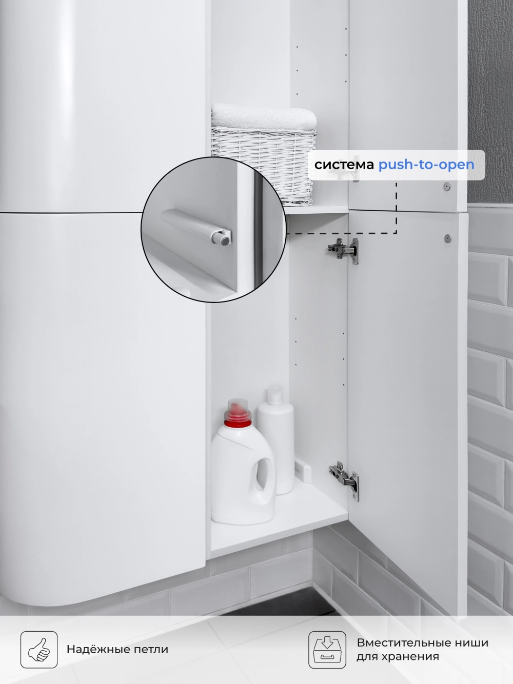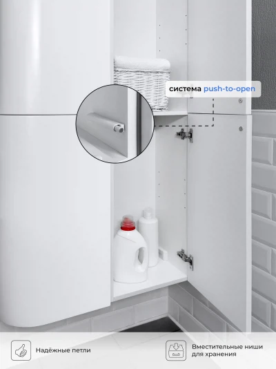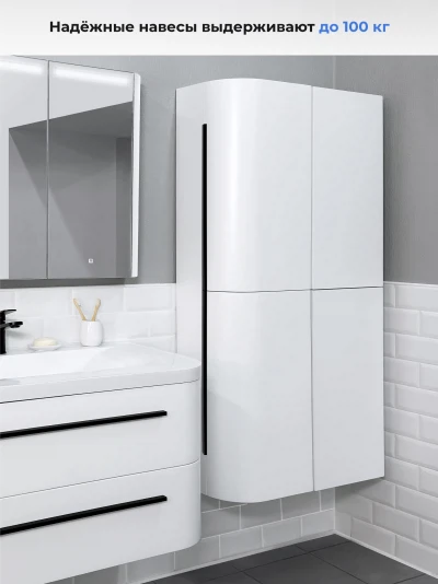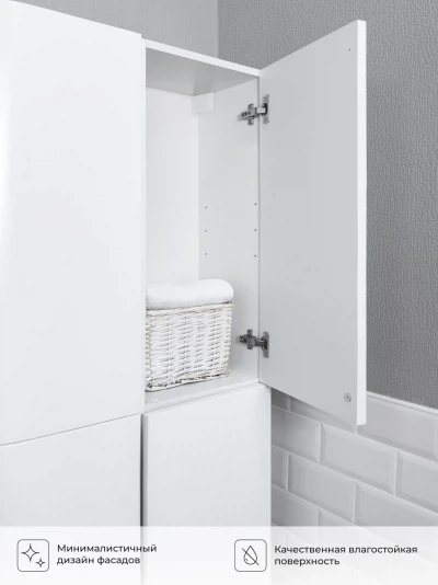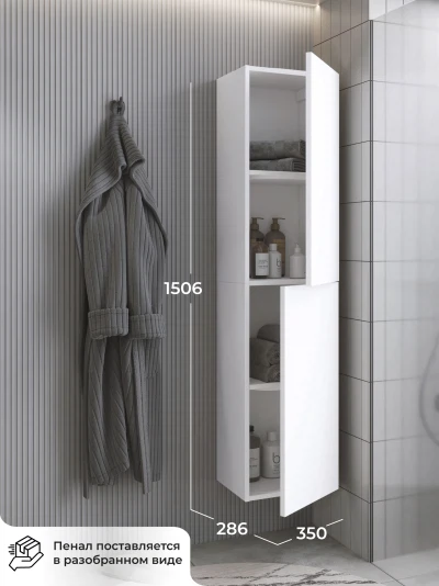 Шкаф пенал подвесной прямой Reddis 35 - это стильное и функциональное решение для организации пространства в вашей ванной комнате. Благодаря его компактным размерам 350х286х1506 и настенному крепежу он занимает немного места и надежно закрепляется. Этот пенал, выполненный из качественного МДФ с матовой белой поверхностью, что обеспечивает ему привлекательный внешний вид, а также износостойкость и долговечность. Качественная фурнитура с доводчиками и фрезерованные ручки обеспечивают легкое открывание и плавное закрывание дверок. Двухсекционный пенал оснащен двумя полками, что позволяет удобно разместить все необходимые принадлежности. Полки пенала легко переставить, возможно регулировать расстояние их между собой. Для точного выбора пенала в ванную комнату рекомендуем обратиться к схеме замеров, которая находится на фото в карточке товара. Размеры изделия могут отличаться +/-1 см в связи со спецификой производства. Дополнить комплект можно тумбой с раковиной и зеркалом из коллекции Verona. Изделия коллекции качественные, функциональные и органически впишутся в популярные и современные интерьерные решения для ванных комнат.