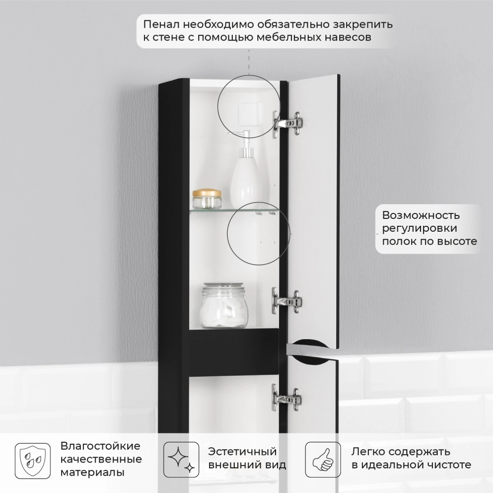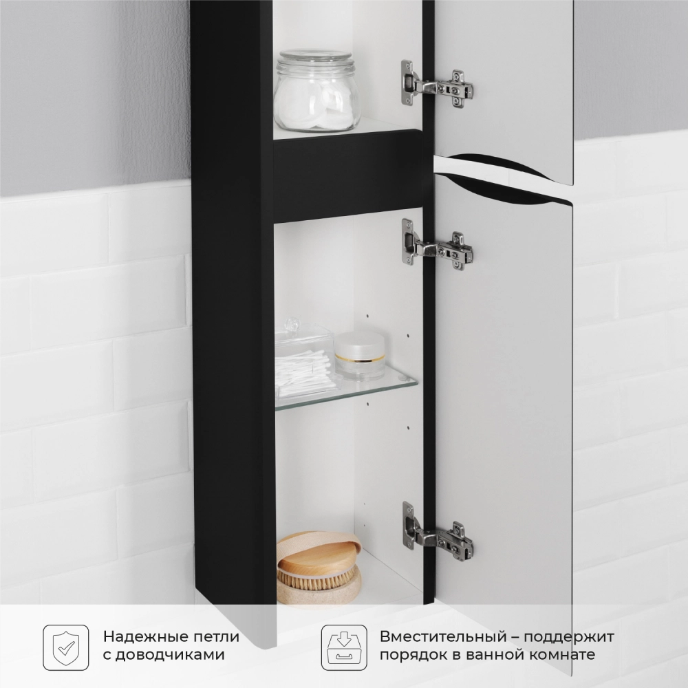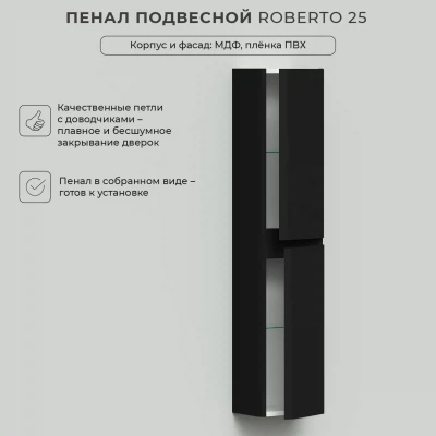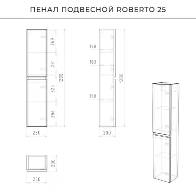 Пенал в ванную из коллекции Roberto 25 в стиле модерн с удобной организацией внутреннего пространства шкафов. Шкаф-пенал поможет создать комфортные условия в ванной комнате. Благодаря его компактным размерам 250х200х1200 и настенному крепежу он занимает немного места и надежно закрепляется. Пенал в ванную изготовлен из МДФ и покрыт ПВХ пленкой, что обеспечивает ему привлекательный внешний вид, а также износостойкость и долговечность. Качественная фурнитура с доводчиками обеспечивает легкое открывание и плавное закрывание дверок. Внутри пенала для ванной полки, где можно рационально распределить и разместить все необходимые вещи для ванной комнаты. Полки пенала легко переставить, возможно регулировать расстояние их между собой. Для точного выбора пенала в ванную комнату рекомендуем обратиться к схеме замеров, которая находится на фото в карточке товара. Размеры изделия могут отличаться +/-1 см в связи со спецификой производства. Дополнить комплект можно тумбой с раковиной и зеркалом из коллекции Roberto. Изделия коллекции качественные, функциональные и органически впишутся в популярные и современные интерьерные решения для ванных комнат. Шкаф пенал для ванной комнаты доставляется в предварительно собранном виде, надежно упакован.