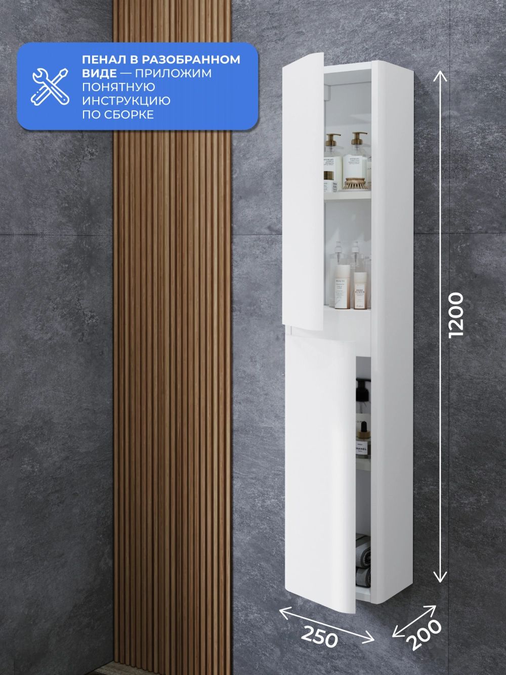 Пенал в ванную из коллекции Roberto 25 в стиле модерн с удобной организацией внутреннего пространства шкафов. Шкаф-пенал поможет создать комфортные условия в ванной комнате. Благодаря его компактным размерам 250х200х1200 и настенному крепежу он занимает немного места и надежно закрепляется. Дверь шкафа универсальна, возможно установить на любую сторону, как правое, так и левое открывание. Пенал в ванную изготовлен из МДФ и покрыт ПВХ пленкой, что обеспечивает ему привлекательный внешний вид, а также износостойкость и долговечность. Качественная фурнитура с доводчиками обеспечивает легкое открывание и плавное закрывание дверок. Внутри пенала для ванной полки, где можно рационально распределить и разместить все необходимые вещи для ванной комнаты. Полки пенала легко переставить, возможно регулировать расстояние их между собой. Для точного выбора пенала в ванную комнату рекомендуем обратиться к схеме замеров, которая находится на фото в карточке товара. Размеры изделия могут отличаться +/-1 см в связи со спецификой производства. Дополнить комплект можно тумбой с раковиной и зеркалом из коллекции Roberto. Изделия коллекции качественные, функциональные и органически впишутся в популярные и современные интерьерные решения для ванных комнат.