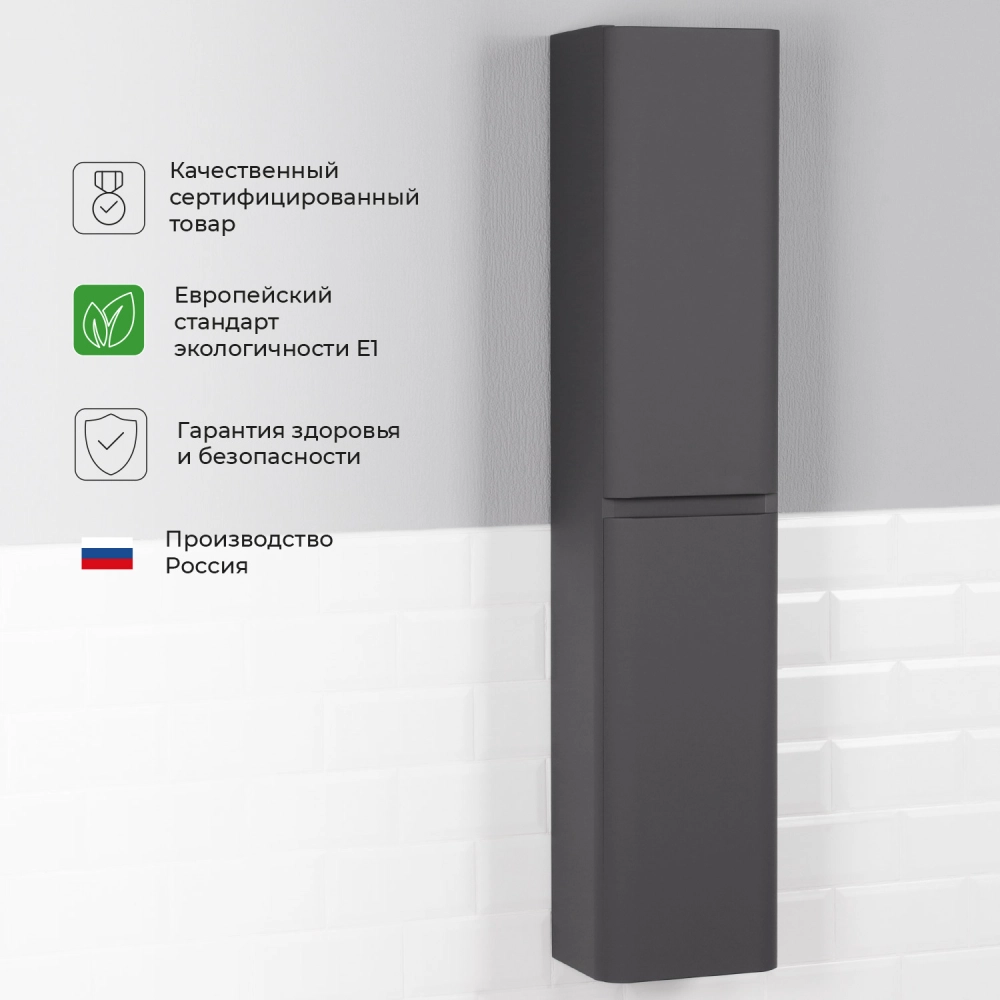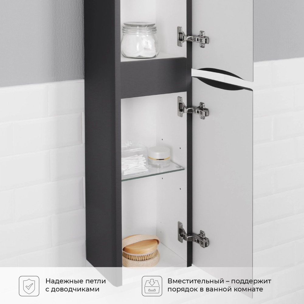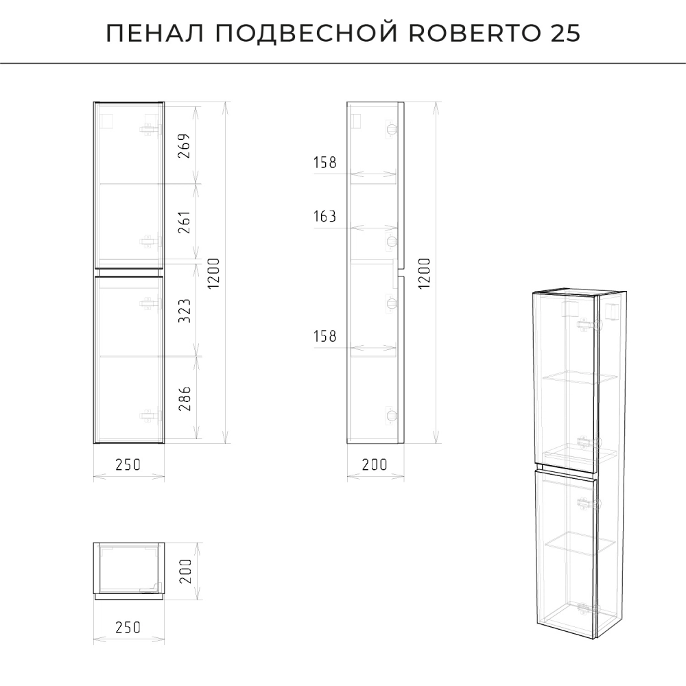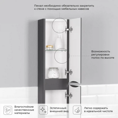 Пенал в ванную из коллекции Roberto 25 в стиле модерн с удобной организацией внутреннего пространства шкафов. Шкаф-пенал поможет создать комфортные условия в ванной комнате. Благодаря его компактным размерам 250х200х1200 и настенному крепежу он занимает немного места и надежно закрепляется. Дверь шкафа универсальна, возможно установить на любую сторону, как правое, так и левое открывание. Пенал в ванную изготовлен из МДФ и покрыт ПВХ пленкой, что обеспечивает ему привлекательный внешний вид, а также износостойкость и долговечность. Качественная фурнитура с доводчиками обеспечивает легкое открывание и плавное закрывание дверок. Внутри пенала для ванной полки, где можно рационально распределить и разместить все необходимые вещи для ванной комнаты. Полки пенала легко переставить, возможно регулировать расстояние их между собой. Для точного выбора пенала в ванную комнату рекомендуем обратиться к схеме замеров, которая находится на фото в карточке товара. Размеры изделия могут отличаться +/-1 см в связи со спецификой производства. Дополнить комплект можно тумбой с раковиной и зеркалом из коллекции Roberto. Изделия коллекции качественные, функциональные и органически впишутся в популярные и современные интерьерные решения для ванных комнат. Шкаф пенал для ванной комнаты доставляется в предварительно собранном виде, надежно упакован.