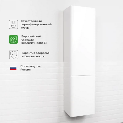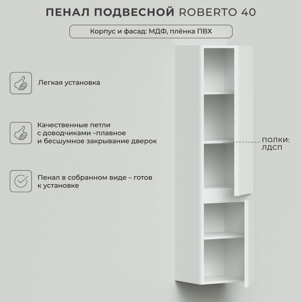 Пенал в ванную из коллекции Roberto 40 в стиле модерн с удобной организацией внутреннего пространства шкафов. Шкаф-пенал поможет создать комфортные условия в ванной комнате. Благодаря его компактным размерам 400х350х1550 и настенному крепежу он занимает немного места и надежно закрепляется. Дверь шкафа для ванной с правосторонним открыванием. Пенал в ванную изготовлен из МДФ и покрыт ПВХ пленкой, что обеспечивает ему привлекательный внешний вид, а также износостойкость и долговечность. Качественная фурнитура с доводчиками обеспечивает легкое открывание и плавное закрывание дверок. Внутри пенала для ванной полки, где можно рационально распределить и разместить все необходимые вещи для ванной комнаты. Полки пенала легко переставить, возможно регулировать расстояние их между собой. Для точного выбора пенала в ванную комнату рекомендуем обратиться к схеме замеров, которая находится на фото в карточке товара. Размеры изделия могут отличаться +/-1 см в связи со спецификой производства. Дополнить комплект можно тумбой с раковиной и зеркалом из коллекции Roberto. Изделия коллекции качественные, функциональные и органически впишутся в популярные и современные интерьерные решения для ванных комнат. Шкаф пенал для ванной комнаты доставляется в предварительно собранном виде, надежно упакован.
