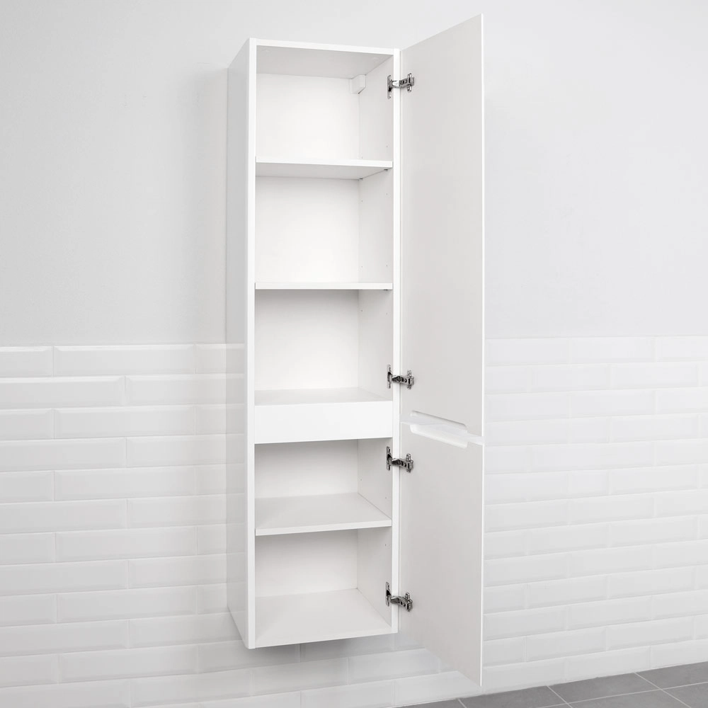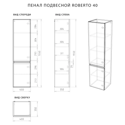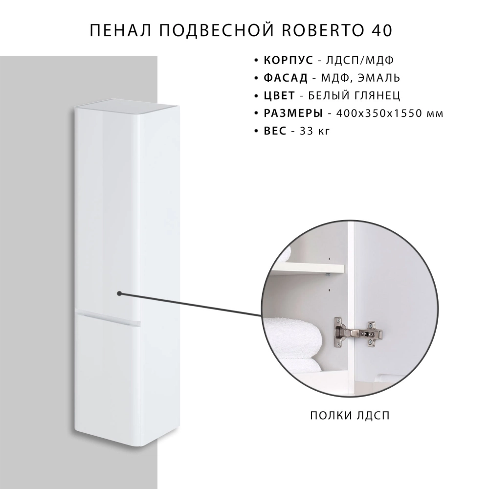 Пенал в ванную из коллекции Roberto 40 в стиле модерн с удобной организацией внутреннего пространства шкафов. Шкаф-пенал поможет создать комфортные условия в ванной комнате. Благодаря его компактным размерам 400х350х1550 и настенному крепежу он занимает немного места и надежно закрепляется. Дверь шкафа для ванной с правосторонним открыванием. Пенал в ванную изготовлен из МДФ и покрыт ПВХ пленкой, что обеспечивает ему привлекательный внешний вид, а также износостойкость и долговечность. Качественная фурнитура с доводчиками обеспечивает легкое открывание и плавное закрывание дверок. Внутри пенала для ванной полки, где можно рационально распределить и разместить все необходимые вещи для ванной комнаты. Полки пенала легко переставить, возможно регулировать расстояние их между собой. Для точного выбора пенала в ванную комнату рекомендуем обратиться к схеме замеров, которая находится на фото в карточке товара. Размеры изделия могут отличаться +/-1 см в связи со спецификой производства. Дополнить комплект можно тумбой с раковиной и зеркалом из коллекции Roberto. Изделия коллекции качественные, функциональные и органически впишутся в популярные и современные интерьерные решения для ванных комнат. Шкаф пенал для ванной комнаты доставляется в предварительно собранном виде, надежно упакован.