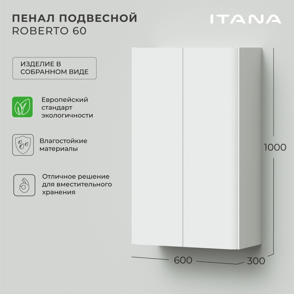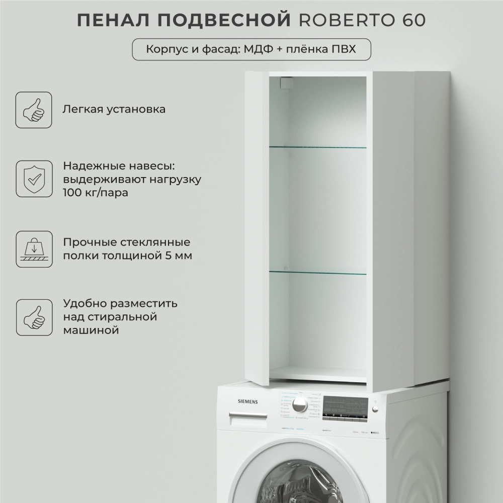 Пенал в ванную из коллекции Roberto 60 в стиле модерн с удобной организацией внутреннего пространства шкафов. Шкаф-пенал поможет создать комфортные условия в ванной комнате. Благодаря его компактным размерам 600х300х1000 и настенному крепежу он занимает немного места и надежно закрепляется. Пенал в ванную изготовлен из МДФ и покрыт ПВХ пленкой, что обеспечивает ему привлекательный внешний вид, а также износостойкость и долговечность. Качественная фурнитура с доводчиками обеспечивает легкое открывание и плавное закрывание дверок. Внутри пенала для ванной полки, где можно рационально распределить и разместить все необходимые вещи для ванной комнаты. Полки пенала легко переставить, возможно регулировать расстояние их между собой. Для точного выбора пенала в ванную комнату рекомендуем обратиться к схеме замеров, которая находится на фото в карточке товара. Размеры изделия могут отличаться +/-1 см в связи со спецификой производства. Дополнить комплект можно тумбой с раковиной и зеркалом из коллекции Roberto. Изделия коллекции качественные, функциональные и органически впишутся в популярные и современные интерьерные решения для ванных комнат. Шкаф пенал для ванной комнаты доставляется в предварительно собранном виде, надежно упакован.