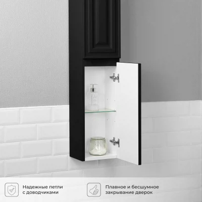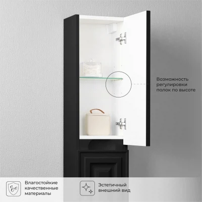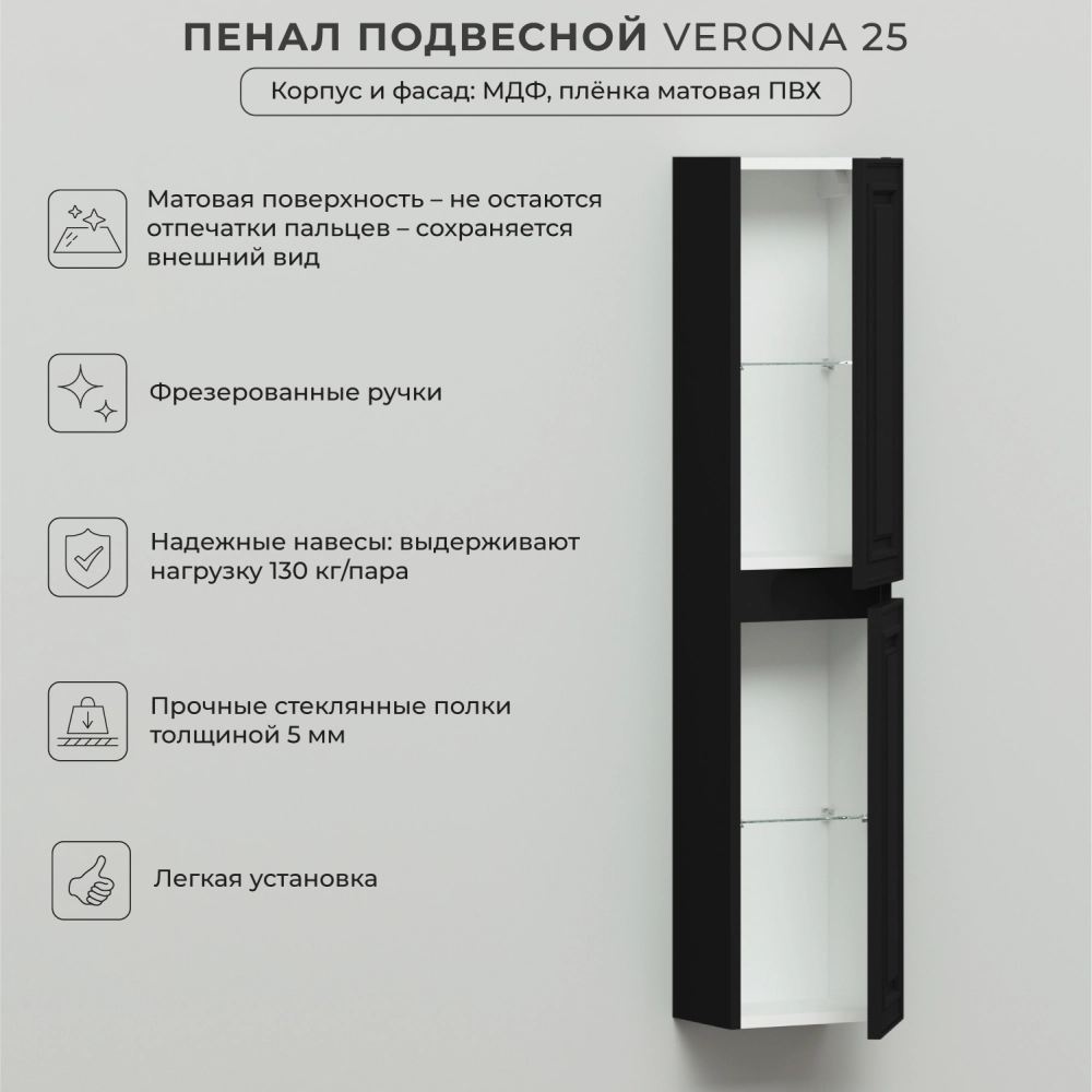 Пенал в ванную из коллекции Verona 25 - это универсальное решение для современной ванной. Шкаф-пенал поможет создать комфортные условия в ванной комнате. Благодаря его компактным размерам 250х200х1200 и настенному крепежу он занимает немного места и надежно закрепляется. Пенал в ванную изготовлен из МДФ и покрыт ПВХ пленкой, что обеспечивает ему привлекательный внешний вид, а также износостойкость и долговечность. Качественная фурнитура с доводчиками и фрезерованные ручки обеспечивают легкое открывание и плавное закрывание дверок. Внутри пенала для ванной полки, где можно рационально распределить и разместить все необходимые вещи для ванной комнаты. Полки пенала легко переставить, возможно регулировать расстояние их между собой. Для точного выбора пенала в ванную комнату рекомендуем обратиться к схеме замеров, которая находится на фото в карточке товара. Размеры изделия могут отличаться +/-1 см в связи со спецификой производства. Дополнить комплект можно тумбой с раковиной и зеркалом из коллекции Verona. Изделия коллекции качественные, функциональные и органически впишутся в популярные и современные интерьерные решения для ванных комнат. Шкаф пенал для ванной комнаты доставляется в предварительно собранном виде, надежно упакован.