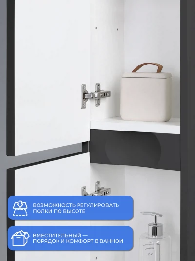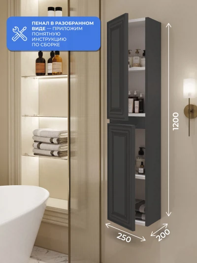 Пенал в ванную из коллекции Verona 25 - это универсальное решение для современной ванной. Шкаф-пенал поможет создать комфортные условия в ванной комнате. Благодаря его компактным размерам 250х200х1200 и настенному крепежу он занимает немного места и надежно закрепляется. Пенал в ванную изготовлен из МДФ и покрыт ПВХ пленкой, что обеспечивает ему привлекательный внешний вид, а также износостойкость и долговечность. Качественная фурнитура с доводчиками и фрезерованные ручки обеспечивают легкое открывание и плавное закрывание дверок. Внутри пенала для ванной полки, где можно рационально распределить и разместить все необходимые вещи для ванной комнаты. Полки пенала легко переставить, возможно регулировать расстояние их между собой. Для точного выбора пенала в ванную комнату рекомендуем обратиться к схеме замеров, которая находится на фото в карточке товара. Размеры изделия могут отличаться +/-1 см в связи со спецификой производства. Дополнить комплект можно тумбой с раковиной и зеркалом из коллекции Verona. Изделия коллекции качественные, функциональные и органически впишутся в популярные и современные интерьерные решения для ванных комнат.