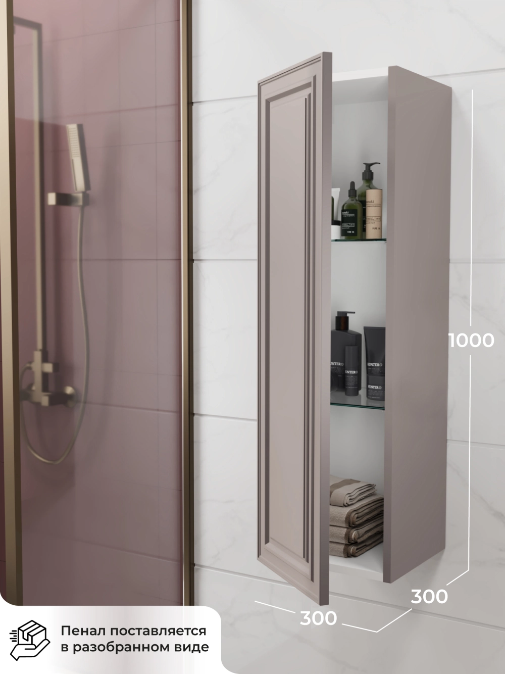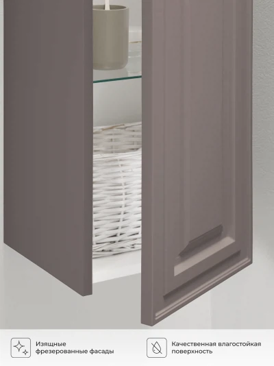 Пенал в ванную из коллекции Verona 30 - это универсальное решение для современной ванной. Шкаф-пенал поможет создать комфортные условия в ванной комнате. Благодаря его компактным размерам 300х300х1000 и настенному крепежу он занимает немного места и надежно закрепляется. Пенал в ванную изготовлен из МДФ, что обеспечивает ему привлекательный внешний вид, а также износостойкость и долговечность. Качественная фурнитура с доводчиками и фрезерованные ручки обеспечивают легкое открывание и плавное закрывание дверок. Внутри пенала для ванной полки, где можно рационально распределить и разместить все необходимые вещи для ванной комнаты. Полки пенала легко переставить, возможно регулировать расстояние их между собой. Для точного выбора пенала в ванную комнату рекомендуем обратиться к схеме замеров, которая находится на фото в карточке товара. Размеры изделия могут отличаться +/-1 см в связи со спецификой производства. Дополнить комплект можно тумбой с раковиной и зеркалом из коллекции Verona. Изделия коллекции качественные, функциональные и органически впишутся в популярные и современные интерьерные решения для ванных комнат. Шкаф пенал для ванной комнаты доставляется в предварительно собранном виде, надежно упакован.