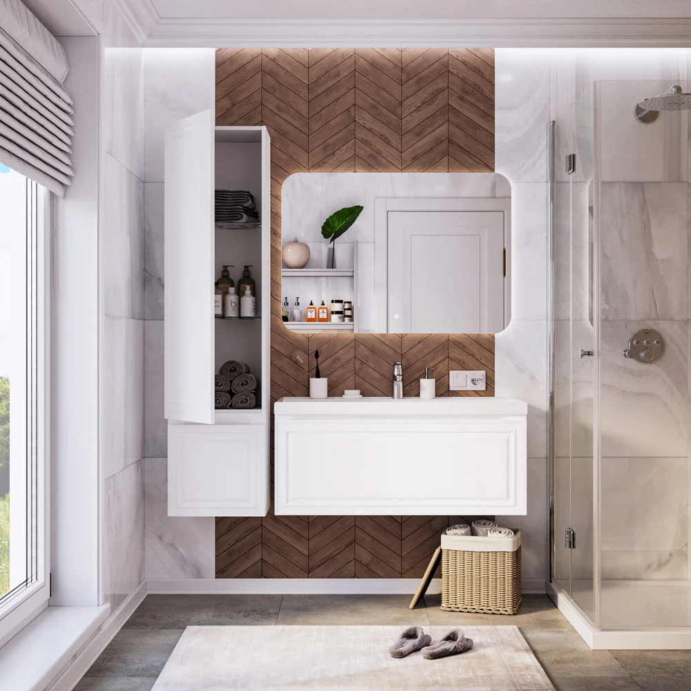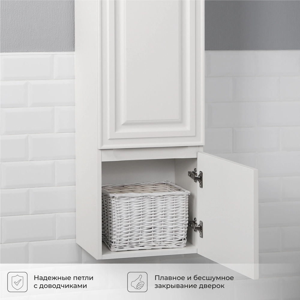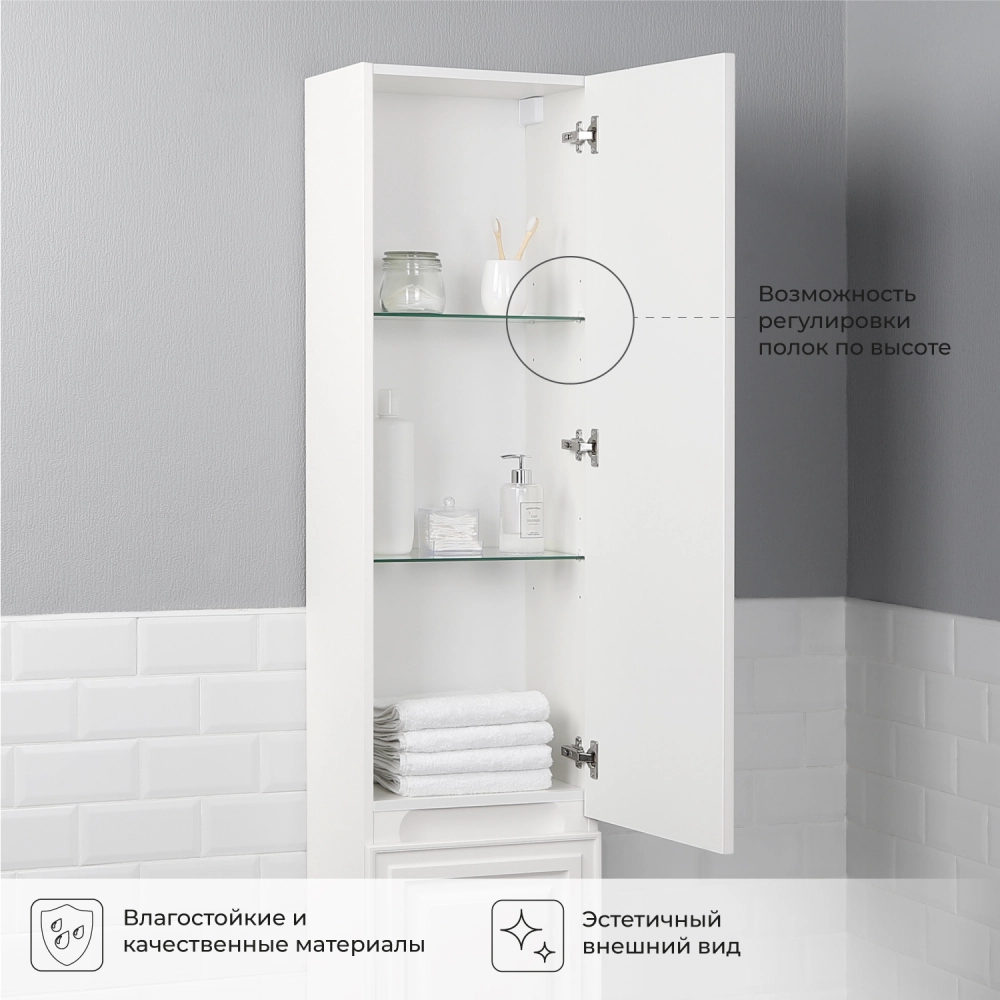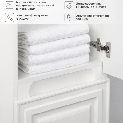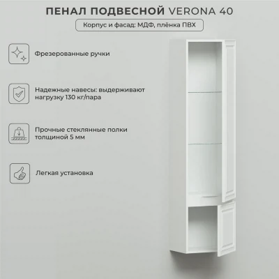 Пенал в ванную из коллекции Verona 40 - это универсальное решение для современной ванной. Шкаф-пенал поможет создать комфортные условия в ванной комнате. Благодаря его компактным размерам 400х300х1600 и настенному крепежу он занимает немного места и надежно закрепляется. Пенал в ванную изготовлен из МДФ и покрыт ПВХ пленкой, что обеспечивает ему привлекательный внешний вид, а также износостойкость и долговечность. Качественная фурнитура с доводчиками и фрезерованные ручки обеспечивают легкое открывание и плавное закрывание дверок. Внутри пенала для ванной полки, где можно рационально распределить и разместить все необходимые вещи для ванной комнаты. Полки пенала легко переставить, возможно регулировать расстояние их между собой. Для точного выбора пенала в ванную комнату рекомендуем обратиться к схеме замеров, которая находится на фото в карточке товара. Размеры изделия могут отличаться +/-1 см в связи со спецификой производства. Дополнить комплект можно тумбой с раковиной и зеркалом из коллекции Verona. Изделия коллекции качественные, функциональные и органически впишутся в популярные и современные интерьерные решения для ванных комнат. Шкаф пенал для ванной комнаты доставляется в предварительно собранном виде, надежно упакован.