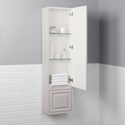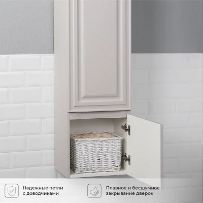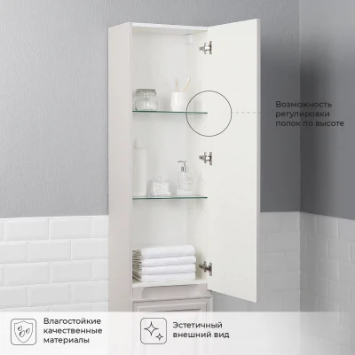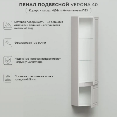 Пенал в ванную из коллекции Verona 40 - это универсальное решение для современной ванной. Шкаф-пенал поможет создать комфортные условия в ванной комнате. Благодаря его компактным размерам 400х300х1600 и настенному крепежу он занимает немного места и надежно закрепляется. Пенал в ванную изготовлен из МДФ и покрыт ПВХ пленкой, что обеспечивает ему привлекательный внешний вид, а также износостойкость и долговечность. Качественная фурнитура с доводчиками и фрезерованные ручки обеспечивают легкое открывание и плавное закрывание дверок. Внутри пенала для ванной полки, где можно рационально распределить и разместить все необходимые вещи для ванной комнаты. Полки пенала легко переставить, возможно регулировать расстояние их между собой. Для точного выбора пенала в ванную комнату рекомендуем обратиться к схеме замеров, которая находится на фото в карточке товара. Размеры изделия могут отличаться +/-1 см в связи со спецификой производства. Дополнить комплект можно тумбой с раковиной и зеркалом из коллекции Verona. Изделия коллекции качественные, функциональные и органически впишутся в популярные и современные интерьерные решения для ванных комнат. Шкаф пенал для ванной комнаты доставляется в предварительно собранном виде, надежно упакован.