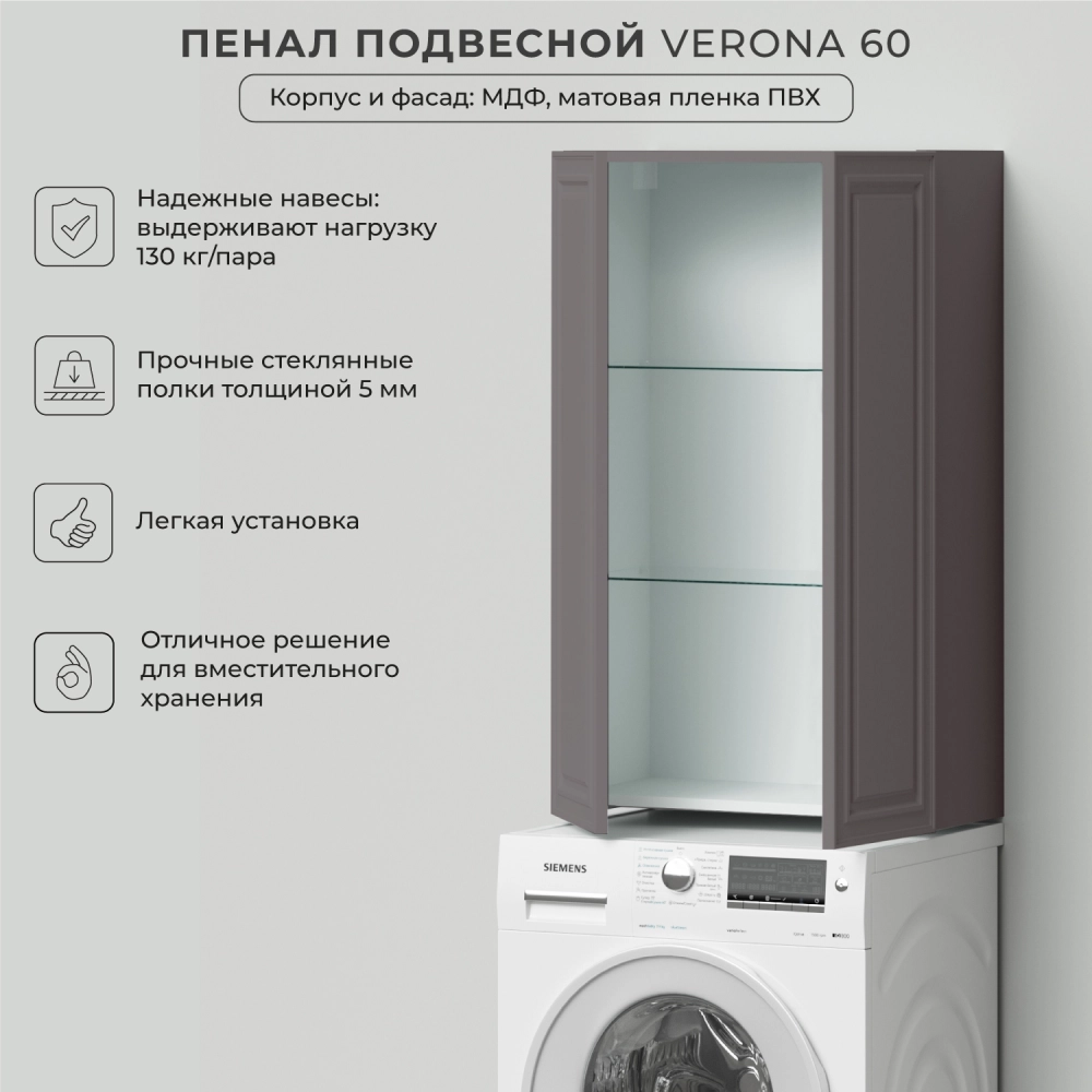 Пенал в ванную из коллекции Verona 60 - это универсальное решение для современной ванной. Шкаф-пенал поможет создать комфортные условия в ванной комнате. Благодаря его компактным размерам 600х300х1000 и настенному крепежу он занимает немного места и надежно закрепляется. Пенал в ванную изготовлен из МДФ и покрыт ПВХ пленкой, что обеспечивает ему привлекательный внешний вид, а также износостойкость и долговечность. Качественная фурнитура с доводчиками и фрезерованные ручки обеспечивают легкое открывание и плавное закрывание дверок. Внутри пенала для ванной полки, где можно рационально распределить и разместить все необходимые вещи для ванной комнаты. Полки пенала легко переставить, возможно регулировать расстояние их между собой. Для точного выбора пенала в ванную комнату рекомендуем обратиться к схеме замеров, которая находится на фото в карточке товара. Размеры изделия могут отличаться +/-1 см в связи со спецификой производства. Дополнить комплект можно тумбой с раковиной и зеркалом из коллекции Verona. Изделия коллекции качественные, функциональные и органически впишутся в популярные и современные интерьерные решения для ванных комнат. Шкаф пенал для ванной комнаты доставляется в предварительно собранном виде, надежно упакован.