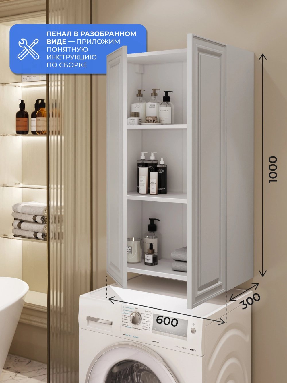Пенал в ванную из коллекции Verona 60 - это универсальное решение для современной ванной. Шкаф-пенал поможет создать комфортные условия в ванной комнате. Благодаря его компактным размерам 600х300х1000 и настенному крепежу он занимает немного места и надежно закрепляется. Пенал в ванную изготовлен из МДФ и покрыт ПВХ пленкой, что обеспечивает ему привлекательный внешний вид, а также износостойкость и долговечность. Качественная фурнитура с доводчиками и фрезерованные ручки обеспечивают легкое открывание и плавное закрывание дверок. Внутри пенала для ванной полки, где можно рационально распределить и разместить все необходимые вещи для ванной комнаты. Полки пенала легко переставить, возможно регулировать расстояние их между собой. Для точного выбора пенала в ванную комнату рекомендуем обратиться к схеме замеров, которая находится на фото в карточке товара. Размеры изделия могут отличаться +/-1 см в связи со спецификой производства. Дополнить комплект можно тумбой с раковиной и зеркалом из коллекции Verona. Изделия коллекции качественные, функциональные и органически впишутся в популярные и современные интерьерные решения для ванных комнат.