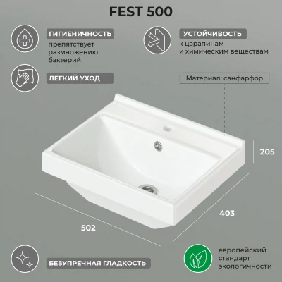 Раковина для ванной Fest 50 станет отличным дополнением к вашей ванной комнате. Раковина накладная имеет современный дизайн и выполнена из качественных материалов, что гарантирует ее долговечность и надежность. Умывальник станет идеальным выбором для тех, кто ищет качественную и стильную раковину для своей ванной комнаты. Совместима с тумбой под раковину в ванную Alta 50. Раковина для ванной доставляется в надежной упаковке.