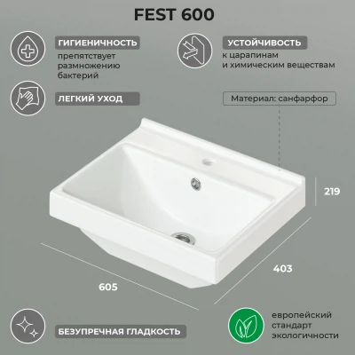Раковина для ванной Fest 60 станет отличным дополнением к вашей ванной комнате. Раковина накладная имеет современный дизайн и выполнена из качественных материалов, что гарантирует ее долговечность и надежность. Она станет идеальным выбором для тех, кто ищет качественную и стильную раковину для своей ванной комнаты. Совместима с тумбой под раковину в ванную Alta 60. Раковина доставляется надежно упакована.