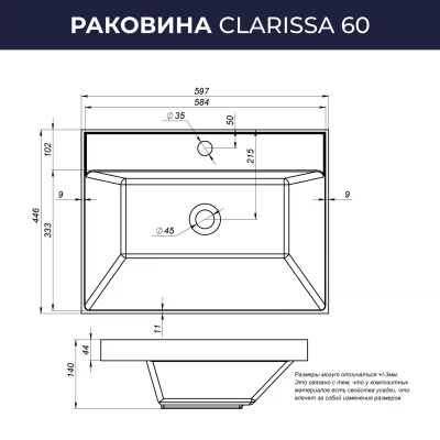 Раковина для ванной Итана Clarissa 60 изготовлена из искусственного мрамора. Верхний слой Гелькоута образует декоративно защитное покрытие. Не содержит вредных для здоровья человека веществ, экологически безопасный. Шумопоглощающая поверхность. Имеет готовое отверстие под смеситель и отверстие слива. Раковина может быть встроена на мебель, в столешницу и на подстолье. Раковина совместима с тумбой под раковину Alexa 60 и с тумбой под раковину в ванную Итана Icon 60. Раковина для ванной доставляется в надежной упаковке