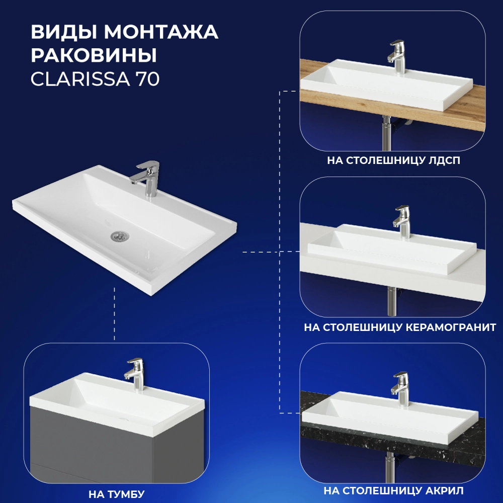Раковина для ванной Итана Clarissa 70 изготовлена из искусственного мрамора. Верхний слой Гелькоута образует декоративно защитное покрытие. Не содержит вредных для здоровья человека веществ, экологически безопасный. Шумопоглощающая поверхность. Имеет готовое отверстие под смеситель. Раковина может быть встроена на мебель, в столешницу и на подстолье. Раковина для ванной совместима с тумбой Icon 70, тумбой под раковину Alexa 70 и тумбой Verona 70. Раковина доставляется в надежной упаковке.