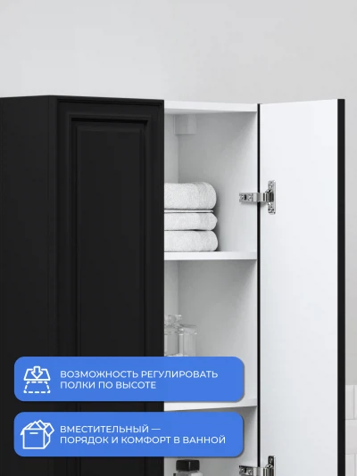 Пенал в ванную из коллекции Верона 60 - это универсальное решение для современной ванной. Шкаф-пенал поможет создать комфортные условия в ванной комнате. Благодаря его компактным размерам 600х300х1000 и настенному крепежу он занимает немного места и надежно закрепляется. Пенал в ванную изготовлен из МДФ и покрыт ПВХ пленкой, что обеспечивает ему привлекательный внешний вид, а также износостойкость и долговечность. Качественная фурнитура с доводчиками и фрезерованные ручки обеспечивают легкое открывание и плавное закрывание дверок. Внутри пенала для ванной полки, где можно рационально распределить и разместить все необходимые вещи для ванной комнаты. Полки пенала легко переставить, возможно регулировать расстояние их между собой. Для точного выбора пенала в ванную комнату рекомендуем обратиться к схеме замеров, которая находится на фото в карточке товара. Размеры изделия могут отличаться +/-1 см в связи со спецификой производства. Дополнить комплект можно тумбой с раковиной и зеркалом из коллекции Верона. Изделия коллекции качественные, функциональные и органически впишутся в популярные и современные интерьерные решения для ванных комнат.