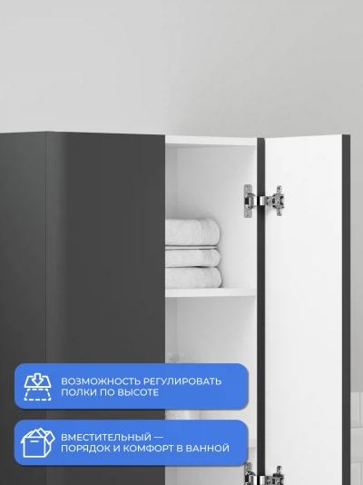 Пенал в ванную из коллекции Роберто 60 в стиле модерн с удобной организацией внутреннего пространства шкафов. Шкаф-пенал поможет создать комфортные условия в ванной комнате. Благодаря его компактным размерам 600х300х1000 и настенному крепежу он занимает немного места и надежно закрепляется. Пенал в ванную изготовлен из МДФ и покрыт ПВХ пленкой, что обеспечивает ему привлекательный внешний вид, а также износостойкость и долговечность. Качественная фурнитура с доводчиками обеспечивает легкое открывание и плавное закрывание дверок. Внутри пенала для ванной полки, где можно рационально распределить и разместить все необходимые вещи для ванной комнаты. Полки пенала легко переставить, возможно регулировать расстояние их между собой. Для точного выбора пенала в ванную комнату рекомендуем обратиться к схеме замеров, которая находится на фото в карточке товара. Размеры изделия могут отличаться +/-1 см в связи со спецификой производства. Дополнить комплект можно тумбой с раковиной и зеркалом из коллекции Роберто. Изделия коллекции качественные, функциональные и органически впишутся в популярные и современные интерьерные решения для ванных комнат.