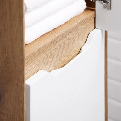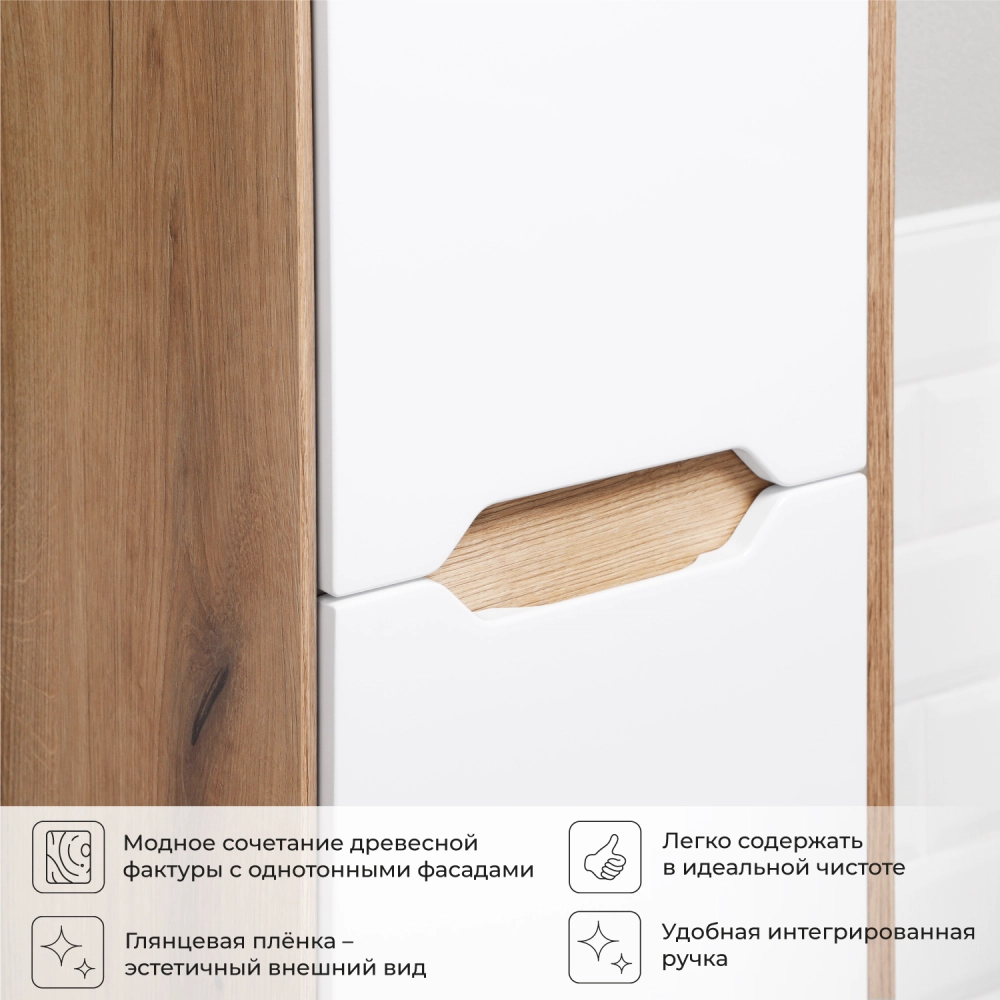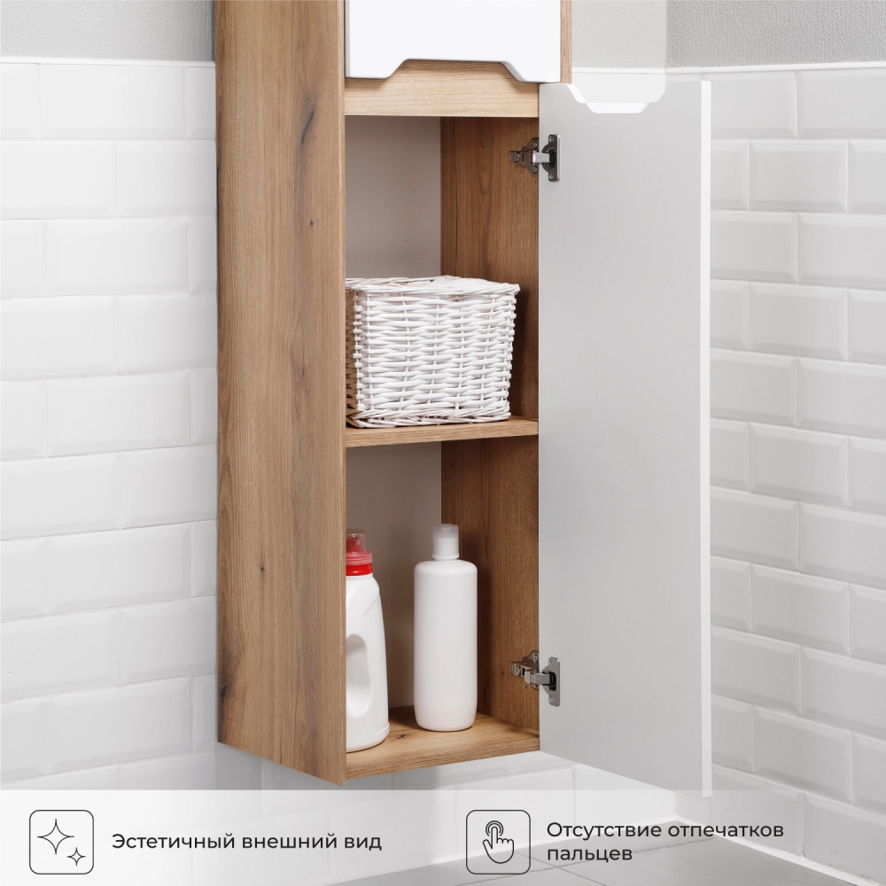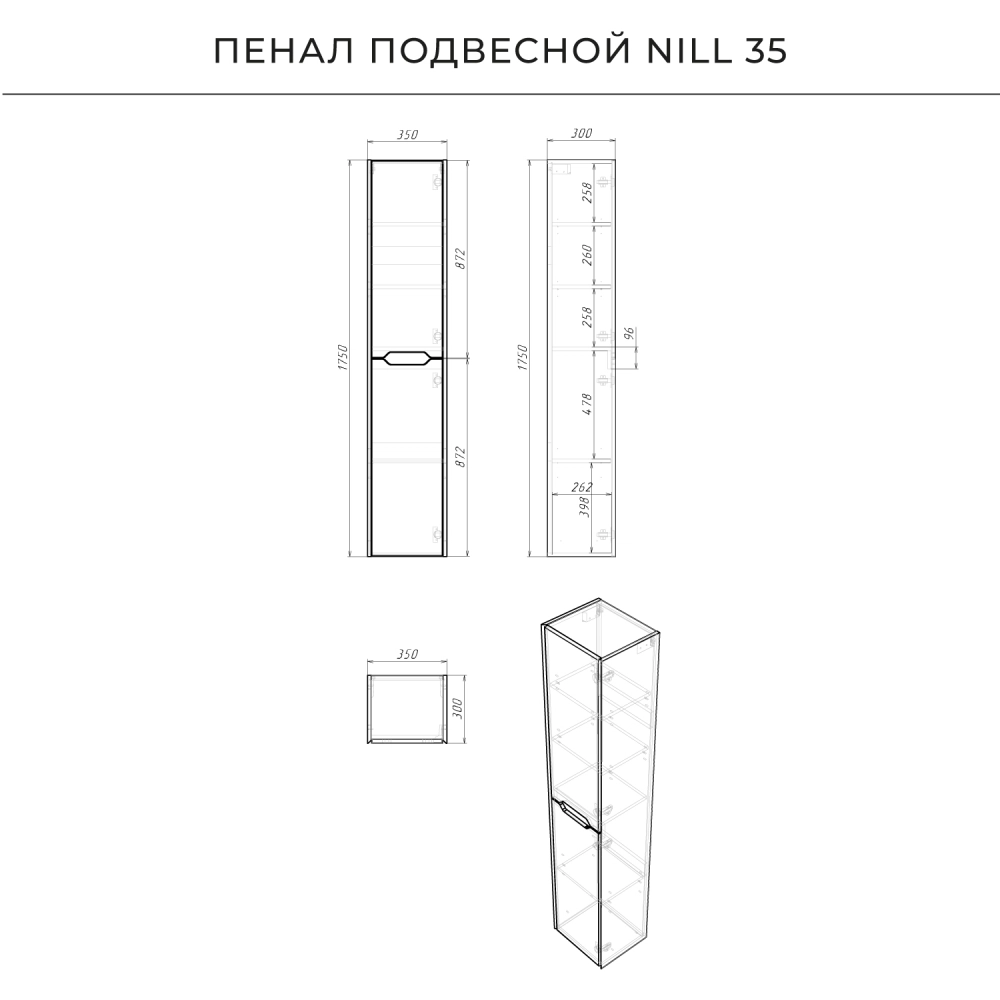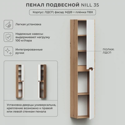 Пенал в ванную из коллекции Nill 35 - это стильное и функциональное решение для хранения ваших ванных принадлежностей. Шкаф-пенал поможет создать комфортные условия в ванной комнате. Благодаря его компактным размерам 350х300х1750 и настенному крепежу он занимает немного места и надежно закрепляется. Корпус пенала для ванной изготолен из ламинированного ДСП, а фасад из МДФ и покрыт ПВХ пленкой, что обеспечивает ему привлекательный внешний вид, а также износостойкость и долговечность. Дверь шкафа универсальна, возможно установить на любую сторону, как правое, так и левое открывание. Качественная фурнитура с доводчиками и интегрированные ручки обеспечивают легкое открывание и плавное закрывание дверок. Внутри шкафа полки, где можно рационально распределить и разместить все необходимые вещи для ванной комнаты. Полки подвесного пенала легко переставить, возможно регулировать расстояние их между собой. Для точного выбора пенала в ванную комнату рекомендуем обратиться к схеме замеров, которая находится на фото в карточке товара. Размеры изделия могут отличаться +/-1 см в связи со спецификой производства. Дополнить комплект можно тумбой с раковиной и зеркалом из коллекции Nill. Изделия коллекции качественные, функциональные и органически впишутся в популярные и современные интерьерные решения для ванных комнат. Шкаф пенал для ванной комнаты доставляется в предварительно собранном виде, надежно упакован.