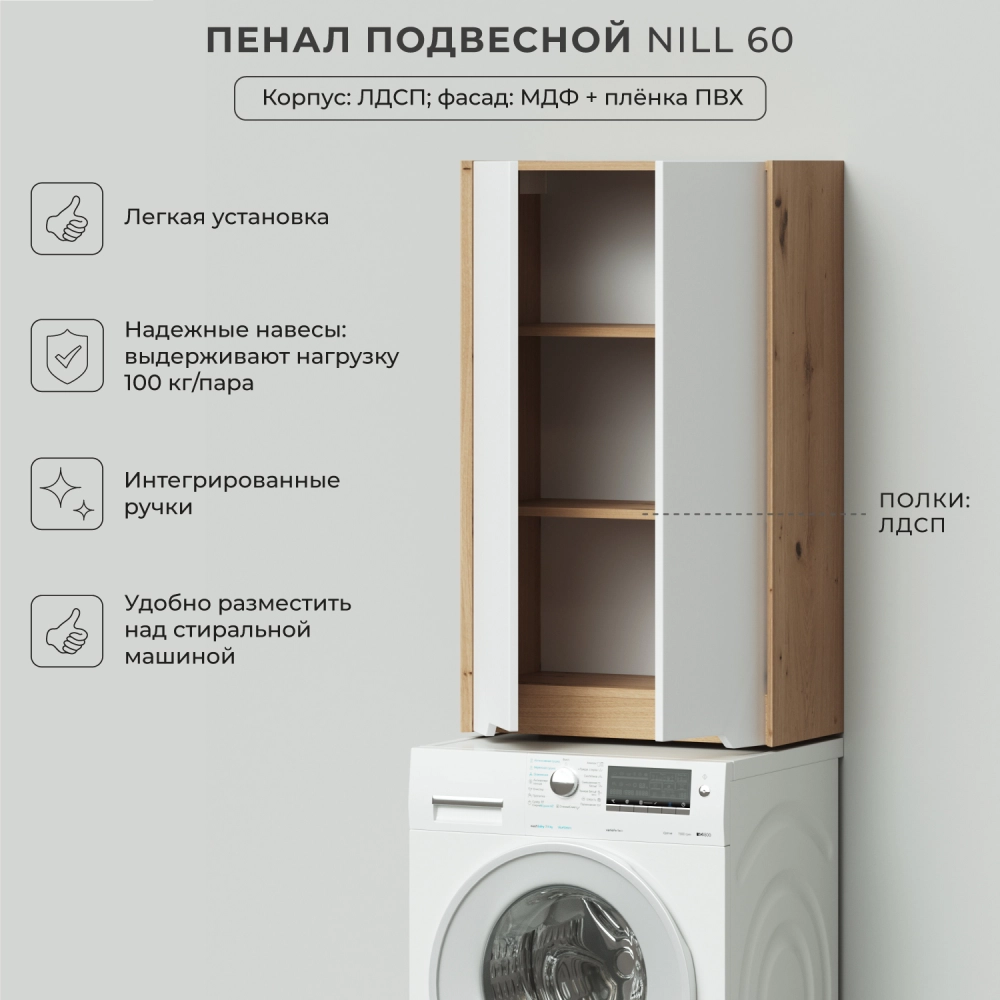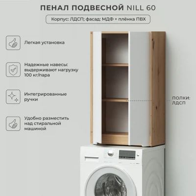 Пенал в ванную из коллекции Nill 60 - это стильное и функциональное решение для хранения ваших ванных принадлежностей. Шкаф-пенал поможет создать комфортные условия в ванной комнате. Благодаря его компактным размерам 600х300х1000 и настенному крепежу он занимает немного места и надежно закрепляется. Корпус пенала для ванной изготолен из ламинированного ДСП, а фасад из МДФ и покрыт ПВХ пленкой, что обеспечивает ему привлекательный внешний вид, а также износостойкость и долговечность. Качественная фурнитура с доводчиками обеспечивает легкое открывание и плавное закрывание дверок. Внутри шкафа полки, где можно рационально распределить и разместить все необходимые вещи для ванной комнаты. Полки подвесного пенала легко переставить, возможно регулировать расстояние их между собой. Для точного выбора пенала в ванную комнату рекомендуем обратиться к схеме замеров, которая находится на фото в карточке товара. Размеры изделия могут отличаться +/-1 см в связи со спецификой производства. Дополнить комплект можно тумбой с раковиной и зеркалом из коллекции Nill. Изделия коллекции качественные, функциональные и органически впишутся в популярные и современные интерьерные решения для ванных комнат. Шкаф пенал для ванной комнаты доставляется в предварительно собранном виде, надежно упакован.
