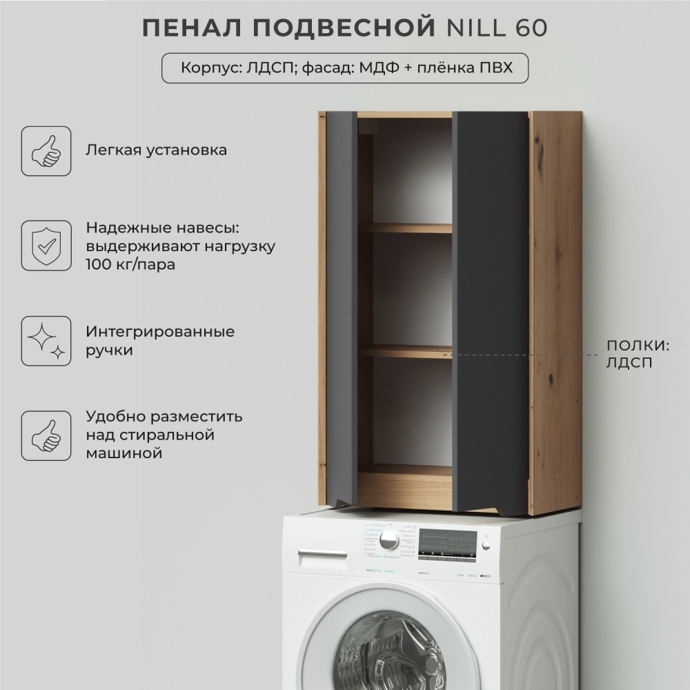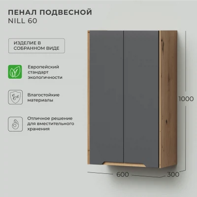 Пенал в ванную из коллекции Nill 60 - это стильное и функциональное решение для хранения ваших ванных принадлежностей. Шкаф-пенал поможет создать комфортные условия в ванной комнате. Благодаря его компактным размерам 600х300х1000 и настенному крепежу он занимает немного места и надежно закрепляется. Корпус пенала для ванной изготолен из ламинированного ДСП, а фасад из МДФ и покрыт ПВХ пленкой, что обеспечивает ему привлекательный внешний вид, а также износостойкость и долговечность. Качественная фурнитура с доводчиками обеспечивает легкое открывание и плавное закрывание дверок. Внутри шкафа полки, где можно рационально распределить и разместить все необходимые вещи для ванной комнаты. Полки подвесного пенала легко переставить, возможно регулировать расстояние их между собой. Для точного выбора пенала в ванную комнату рекомендуем обратиться к схеме замеров, которая находится на фото в карточке товара. Размеры изделия могут отличаться +/-1 см в связи со спецификой производства. Дополнить комплект можно тумбой с раковиной и зеркалом из коллекции Nill. Изделия коллекции качественные, функциональные и органически впишутся в популярные и современные интерьерные решения для ванных комнат. Шкаф пенал для ванной комнаты доставляется в предварительно собранном виде, надежно упакован.