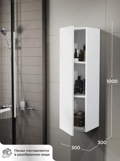 Пенал в ванную из коллекции Кейт 30 - воплотил в себе тренд на фактурные фасады. Идеальный "рубчик" - простое и стильное дизайнерское решение для декорирования фасадов, этот пенал бесспорно станет украшением современной ванной комнаты. Благодаря его компактным размерам 300х300х1000 и настенному крепежу он занимает немного места и надежно закрепляется. Пенал в ванную изготовлен из МДФ и покрыт ПВХ пленкой, что обеспечивает ему привлекательный внешний вид, а также износостойкость и долговечность. Качественная фурнитура с доводчиками и удобные фрезерованные ручки обеспечивают легкое открывание и плавное закрывание дверок. Внутри у шкафа полки, где можно рационально распределить и разместить все необходимые вещи для ванной комнаты. Полки пенала легко переставить, возможно регулировать расстояние их между собой. Для точного выбора пенала в ванную комнату рекомендуем обратиться к схеме замеров, которая находится на фото в карточке товара. Размеры изделия могут отличаться +/-1 см в связи со спецификой производства. Дополнить комплект можно тумбой с раковиной и зеркалом из коллекции Кейт. Изделия коллекции качественные, функциональные и органически впишутся в популярные и современные интерьерные решения для ванных комнат.