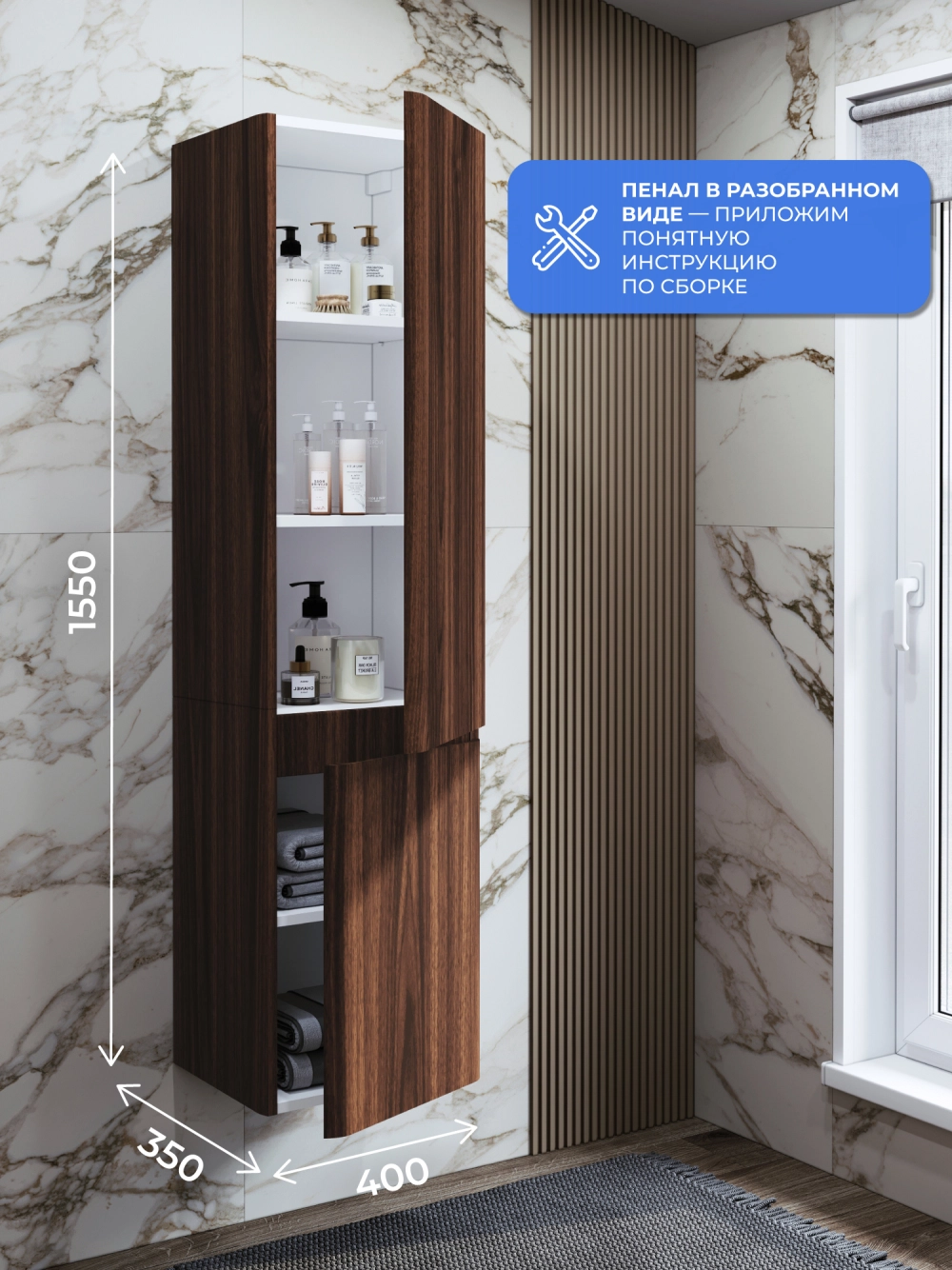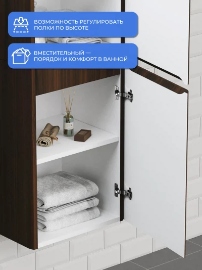 Пенал в ванную из коллекции Роберто 40 в стиле модерн с удобной организацией внутреннего пространства шкафов. Шкаф-пенал поможет создать комфортные условия в ванной комнате. Благодаря его компактным размерам 400х350х1550 и настенному крепежу он занимает немного места и надежно закрепляется. Дверь шкафа для ванной с правосторонним открыванием. Пенал в ванную изготовлен из МДФ и покрыт ПВХ пленкой, что обеспечивает ему привлекательный внешний вид, а также износостойкость и долговечность. Качественная фурнитура с доводчиками обеспечивает легкое открывание и плавное закрывание дверок. Внутри пенала для ванной полки, где можно рационально распределить и разместить все необходимые вещи для ванной комнаты. Полки пенала легко переставить, возможно регулировать расстояние их между собой. Для точного выбора пенала в ванную комнату рекомендуем обратиться к схеме замеров, которая находится на фото в карточке товара. Размеры изделия могут отличаться +/-1 см в связи со спецификой производства. Дополнить комплект можно тумбой с раковиной и зеркалом из коллекции Роберто. Изделия коллекции качественные, функциональные и органически впишутся в популярные и современные интерьерные решения для ванных комнат.