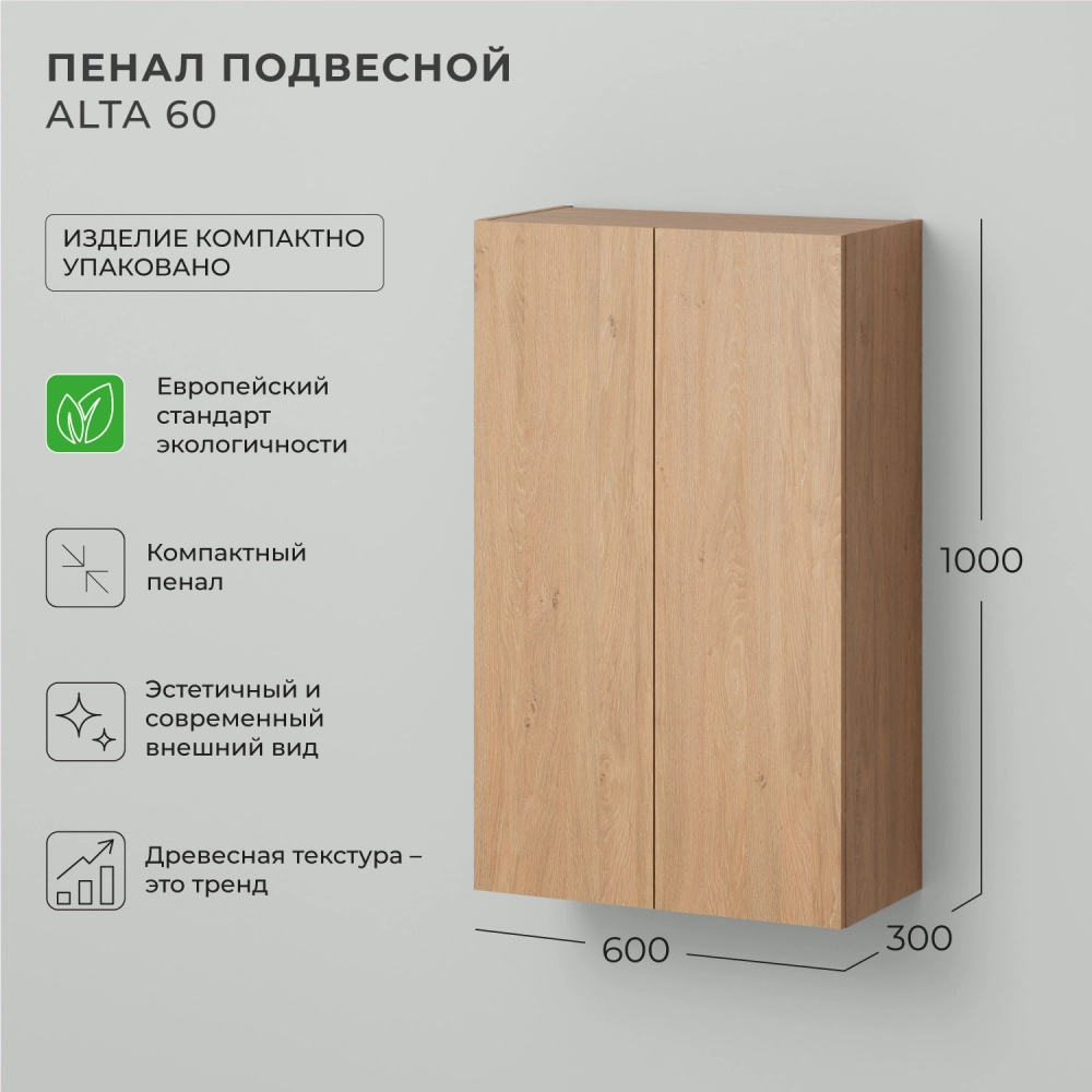 Пенал в ванную из коллекции Alta 60 - это сочетание природного декора. Шкаф-пенал поможет создать комфортные условия в ванной комнате. Благодаря его компактным размерам 600х300х1000 и настенному крепежу он занимает немного места и надежно закрепляется. Пенал можно удобно разместить над стиральной машиной. Шкаф для ванной изготовлен из ламинированного ДСП, поэтому выдерживает высокие эксплуатационные нагрузки. Качественная фурнитура с доводчиками обеспечивает легкое открывание и плавное закрывание дверок. Внутри шкафа полки, где можно рационально распределить и разместить все необходимые вещи для ванной комнаты. Для точного выбора пенала в ванную комнату рекомендуем обратиться к схеме замеров, которая находится на фото в карточке товара. Размеры изделия могут отличаться +/-1 см в связи со спецификой производства. Дополнить комплект можно тумбой с раковиной и зеркалом из коллекции Alta. Изделия коллекции качественные, функциональные и органически впишутся в популярные и современные интерьерные решения для ванных комнат. Шкаф пенал для ванной комнаты доставляется в предварительно собранном виде, надежно упакован.