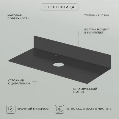 Столешница из керамогранита Итана Mari. Толщина столешницы 10 мм. Устойчива к царапинам. Керамогранит - это чрезвычайно твердая поверхность, не подверженная травлению, окрашиванию и другим повреждениям, которые повседневная жизнь может нанести. Столешница Mari один из стилеобразующих элементов интерьера ванной комнаты, устойчива к постоянной повышенной влажности. Столешница из керамогранита доставляется в надежной упаковке.