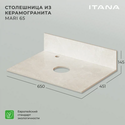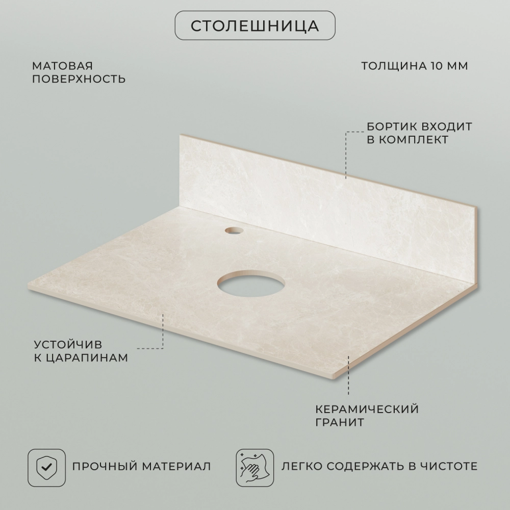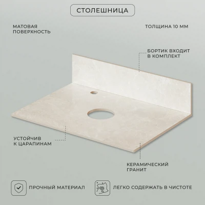 Столешница из керамогранита Итана Mari. Толщина столешницы 10 мм. Устойчива к царапинам. Керамогранит - это чрезвычайно твердая поверхность, не подверженная травлению, окрашиванию и другим повреждениям, которые повседневная жизнь может нанести. Столешница Mari один из стилеобразующих элементов интерьера ванной комнаты, устойчива к постоянной повышенной влажности. Столешница из керамогранита доставляется в надежной упаковке.