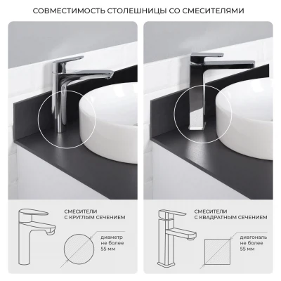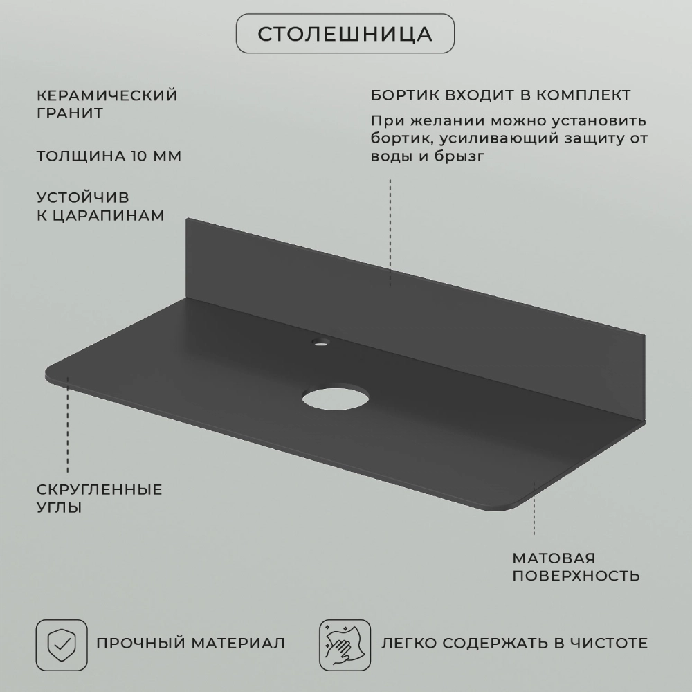 Столешница из керамогранита Итана Roni. Толщина столешницы 10 мм. Устойчива к царапинам. Керамогранит - это чрезвычайно твердая поверхность, не подверженная травлению, окрашиванию и другим повреждениям, которые повседневная жизнь может нанести. Столешница Roni один из стилеобразующих элементов интерьера ванной комнаты, устойчива к постоянной повышенной влажности. Столешница из керамогранита доставляется в надежной упаковке.