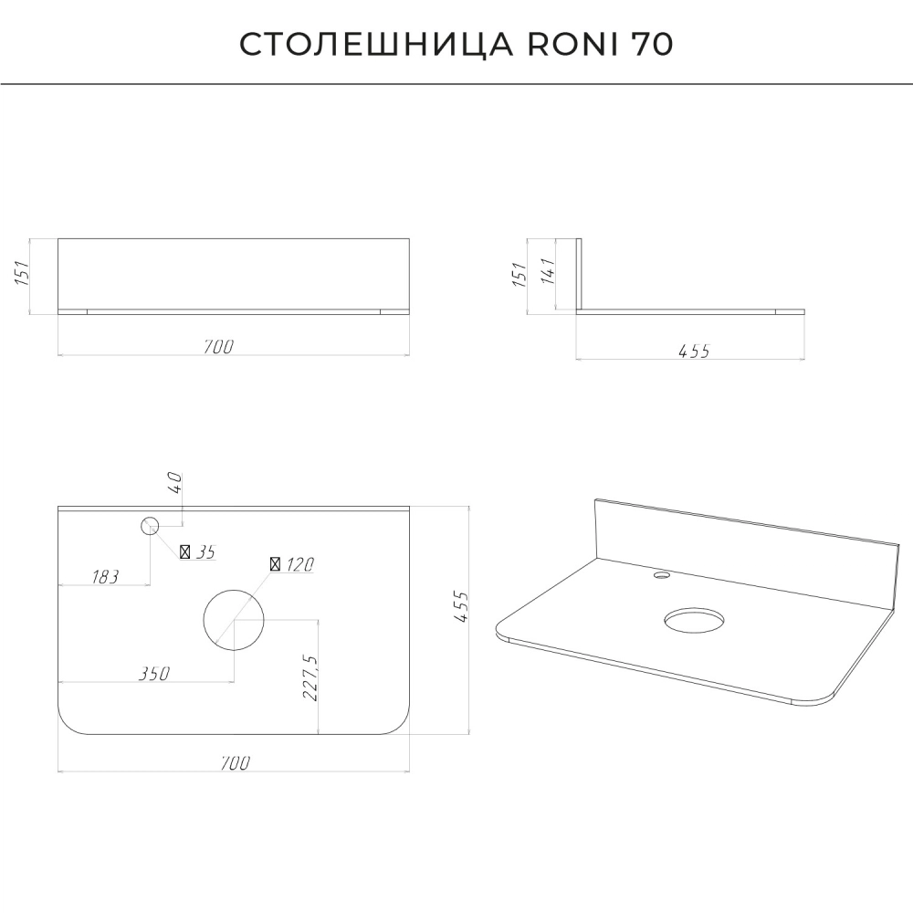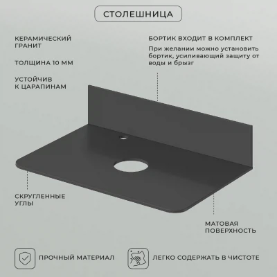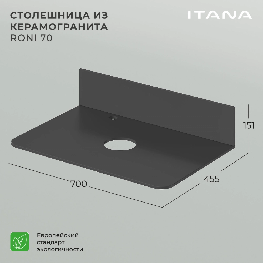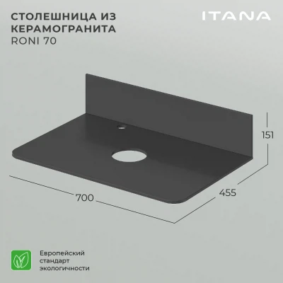 Столешница из керамогранита Итана Roni. Толщина столешницы 10 мм. Устойчива к царапинам. Керамогранит - это чрезвычайно твердая поверхность, не подверженная травлению, окрашиванию и другим повреждениям, которые повседневная жизнь может нанести. Столешница Roni один из стилеобразующих элементов интерьера ванной комнаты, устойчива к постоянной повышенной влажности. Столешница из керамогранита доставляется в надежной упаковке.