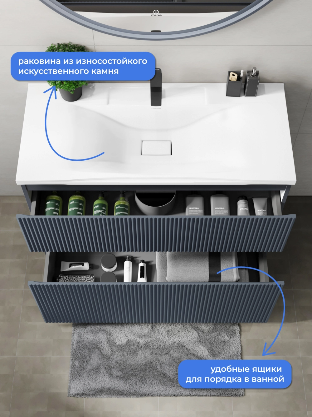 Напольная тумба с раковиной Итана Kate станет идеальным дополнением для вашей ванной комнаты, сочетая в себе стильный дизайн и функциональность. Коллекция Kate - воплотила в себе тренд на фактурные фасады. Идеальный "рубчик" - простое и стильное дизайнерское решение для декорирования фасадов - эта мебель бесспорно станет украшением современной ванной комнаты. Тумба изготовлена из высококачественных материалов, гарантируя долговечность и надежность эксплуатации. Удобные фрезерованные ручки, качественная фурнитура с доводчиками, вместительность - мы продумали все, чтобы тумба была не просто красивой, но еще и функциональной, приятной в использовании. Ее конструкция позволяет легко поддерживать порядок в ванной, ведь все мелочи будут аккуратно убраны. Раковина выполнена из искусственного камня, обладает устойчивостью к механическим повреждениям и влиянию химических средств. Стильный декор тумбы с раковиной добавляет изюминку в общий дизайн, вписываясь в современные и классические интерьеры. Удобные выдвижные ящики обеспечивают простоту доступа к содержимому тумбы. Безупречное сочетание раковины с тумбой подчеркивает общий стиль вашей ванной комнаты, делая ее уютной и функциональной.