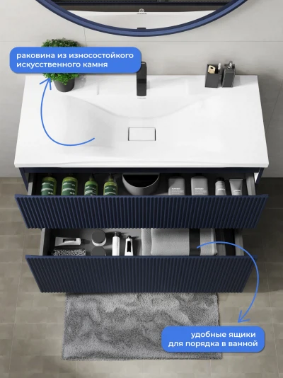 Напольная тумба с раковиной Итана Kate станет идеальным дополнением для вашей ванной комнаты, сочетая в себе стильный дизайн и функциональность. Коллекция Kate - воплотила в себе тренд на фактурные фасады. Идеальный "рубчик" - простое и стильное дизайнерское решение для декорирования фасадов - эта мебель бесспорно станет украшением современной ванной комнаты. Тумба изготовлена из высококачественных материалов, гарантируя долговечность и надежность эксплуатации. Удобные фрезерованные ручки, качественная фурнитура с доводчиками, вместительность - мы продумали все, чтобы тумба была не просто красивой, но еще и функциональной, приятной в использовании. Ее конструкция позволяет легко поддерживать порядок в ванной, ведь все мелочи будут аккуратно убраны. Раковина выполнена из искусственного камня, обладает устойчивостью к механическим повреждениям и влиянию химических средств. Стильный декор тумбы с раковиной добавляет изюминку в общий дизайн, вписываясь в современные и классические интерьеры. Удобные выдвижные ящики обеспечивают простоту доступа к содержимому тумбы. Безупречное сочетание раковины с тумбой подчеркивает общий стиль вашей ванной комнаты, делая ее уютной и функциональной.