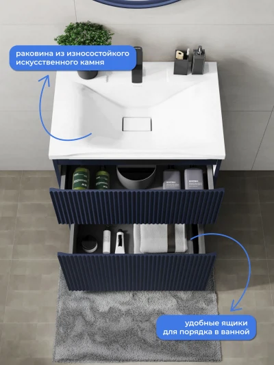 Напольная тумба с раковиной Итана Kate станет идеальным дополнением для вашей ванной комнаты, сочетая в себе стильный дизайн и функциональность. Коллекция Kate - воплотила в себе тренд на фактурные фасады. Идеальный "рубчик" - простое и стильное дизайнерское решение для декорирования фасадов - эта мебель бесспорно станет украшением современной ванной комнаты. Тумба изготовлена из высококачественных материалов, гарантируя долговечность и надежность эксплуатации. Удобные фрезерованные ручки, качественная фурнитура с доводчиками, вместительность - мы продумали все, чтобы тумба была не просто красивой, но еще и функциональной, приятной в использовании. Ее конструкция позволяет легко поддерживать порядок в ванной, ведь все мелочи будут аккуратно убраны. Раковина выполнена из искусственного камня, обладает устойчивостью к механическим повреждениям и влиянию химических средств. Стильный декор тумбы с раковиной добавляет изюминку в общий дизайн, вписываясь в современные и классические интерьеры. Удобные выдвижные ящики обеспечивают простоту доступа к содержимому тумбы. Безупречное сочетание раковины с тумбой подчеркивает общий стиль вашей ванной комнаты, делая ее уютной и функциональной.
