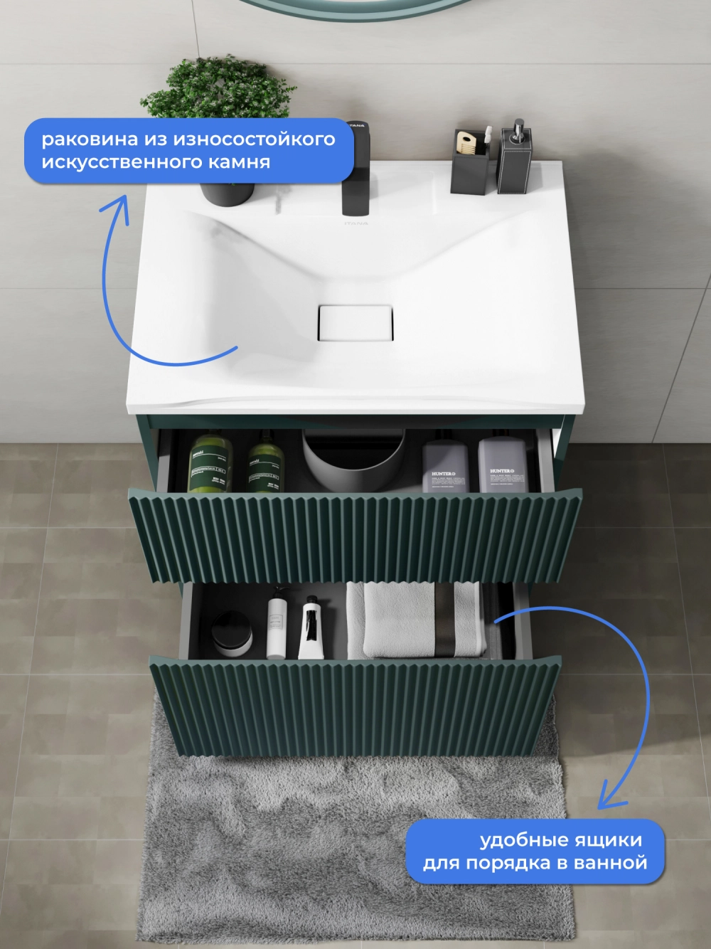Напольная тумба с раковиной Итана Kate станет идеальным дополнением для вашей ванной комнаты, сочетая в себе стильный дизайн и функциональность. Коллекция Kate - воплотила в себе тренд на фактурные фасады. Идеальный "рубчик" - простое и стильное дизайнерское решение для декорирования фасадов - эта мебель бесспорно станет украшением современной ванной комнаты. Тумба изготовлена из высококачественных материалов, гарантируя долговечность и надежность эксплуатации. Удобные фрезерованные ручки, качественная фурнитура с доводчиками, вместительность - мы продумали все, чтобы тумба была не просто красивой, но еще и функциональной, приятной в использовании. Ее конструкция позволяет легко поддерживать порядок в ванной, ведь все мелочи будут аккуратно убраны. Раковина выполнена из искусственного камня, обладает устойчивостью к механическим повреждениям и влиянию химических средств. Стильный декор тумбы с раковиной добавляет изюминку в общий дизайн, вписываясь в современные и классические интерьеры. Удобные выдвижные ящики обеспечивают простоту доступа к содержимому тумбы. Безупречное сочетание раковины с тумбой подчеркивает общий стиль вашей ванной комнаты, делая ее уютной и функциональной.