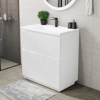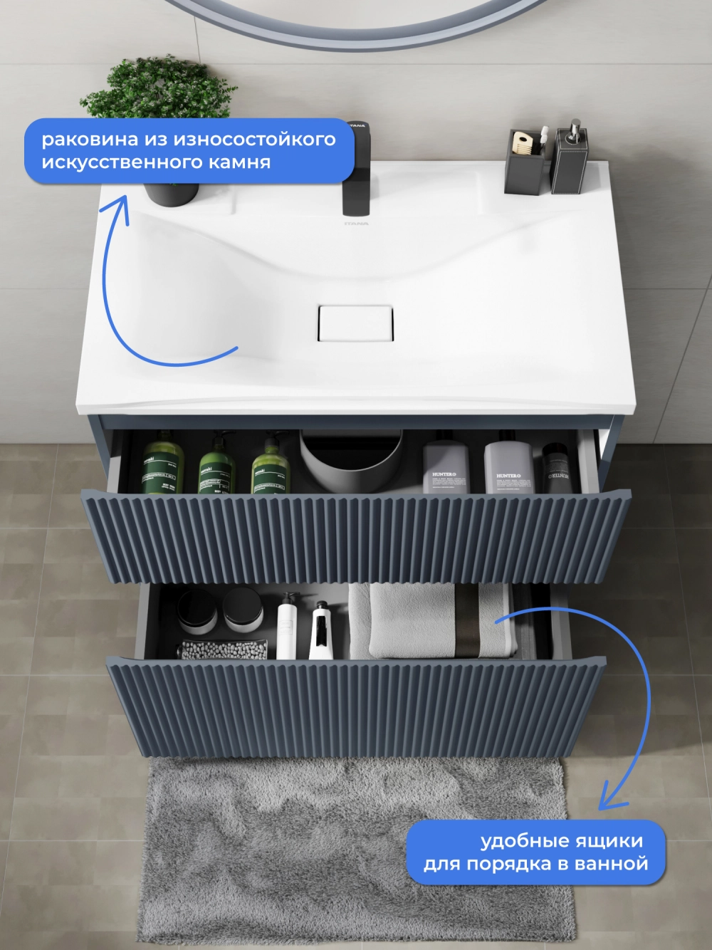 Напольная тумба с раковиной Итана Kate станет идеальным дополнением для вашей ванной комнаты, сочетая в себе стильный дизайн и функциональность. Коллекция Kate - воплотила в себе тренд на фактурные фасады. Идеальный "рубчик" - простое и стильное дизайнерское решение для декорирования фасадов - эта мебель бесспорно станет украшением современной ванной комнаты. Тумба изготовлена из высококачественных материалов, гарантируя долговечность и надежность эксплуатации. Удобные фрезерованные ручки, качественная фурнитура с доводчиками, вместительность - мы продумали все, чтобы тумба была не просто красивой, но еще и функциональной, приятной в использовании. Ее конструкция позволяет легко поддерживать порядок в ванной, ведь все мелочи будут аккуратно убраны. Раковина выполнена из искусственного камня, обладает устойчивостью к механическим повреждениям и влиянию химических средств. Стильный декор тумбы с раковиной добавляет изюминку в общий дизайн, вписываясь в современные и классические интерьеры. Удобные выдвижные ящики обеспечивают простоту доступа к содержимому тумбы. Безупречное сочетание раковины с тумбой подчеркивает общий стиль вашей ванной комнаты, делая ее уютной и функциональной.