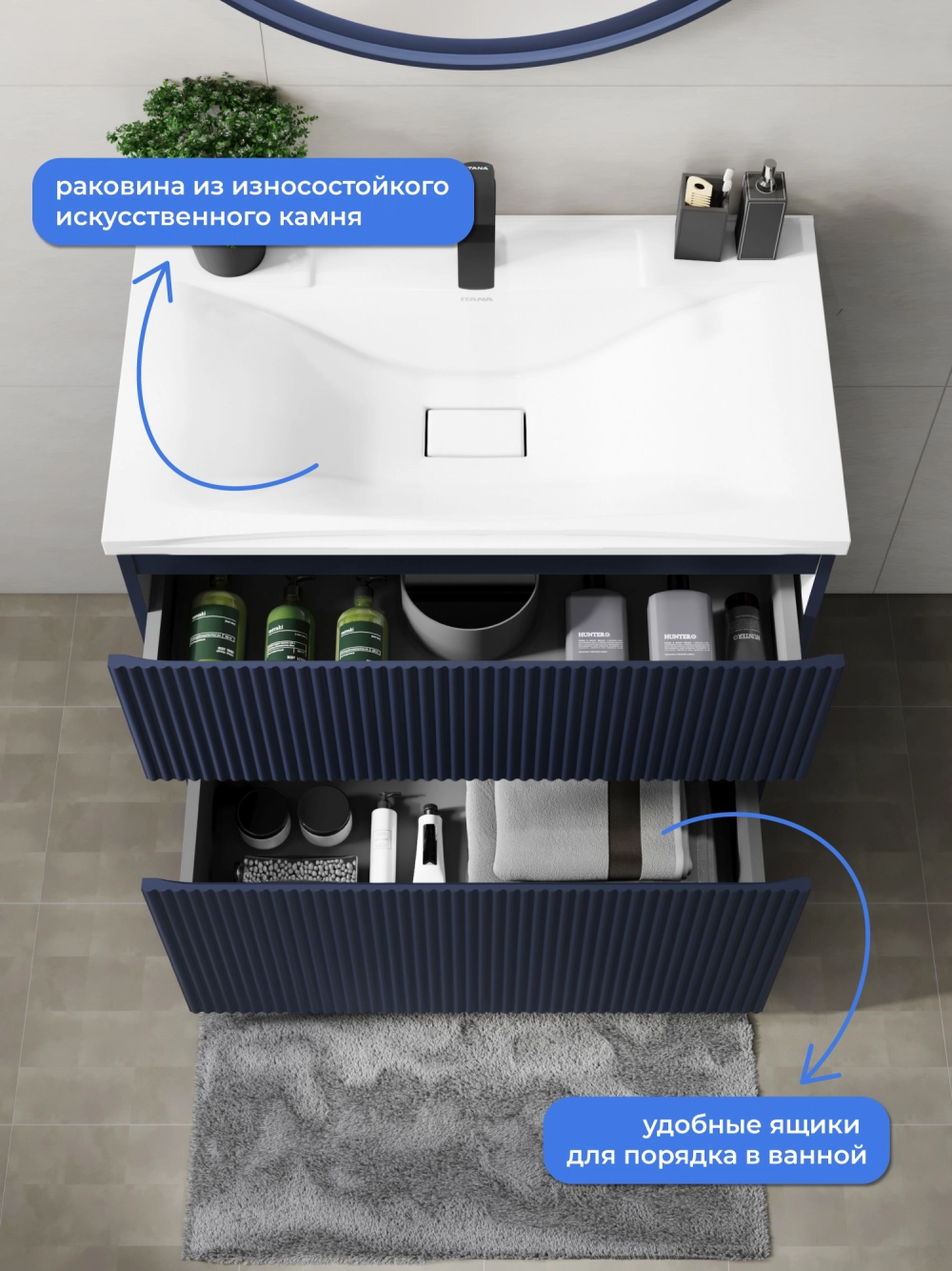 Напольная тумба с раковиной Итана Kate станет идеальным дополнением для вашей ванной комнаты, сочетая в себе стильный дизайн и функциональность. Коллекция Kate - воплотила в себе тренд на фактурные фасады. Идеальный "рубчик" - простое и стильное дизайнерское решение для декорирования фасадов - эта мебель бесспорно станет украшением современной ванной комнаты. Тумба изготовлена из высококачественных материалов, гарантируя долговечность и надежность эксплуатации. Удобные фрезерованные ручки, качественная фурнитура с доводчиками, вместительность - мы продумали все, чтобы тумба была не просто красивой, но еще и функциональной, приятной в использовании. Ее конструкция позволяет легко поддерживать порядок в ванной, ведь все мелочи будут аккуратно убраны. Раковина выполнена из искусственного камня, обладает устойчивостью к механическим повреждениям и влиянию химических средств. Стильный декор тумбы с раковиной добавляет изюминку в общий дизайн, вписываясь в современные и классические интерьеры. Удобные выдвижные ящики обеспечивают простоту доступа к содержимому тумбы. Безупречное сочетание раковины с тумбой подчеркивает общий стиль вашей ванной комнаты, делая ее уютной и функциональной.