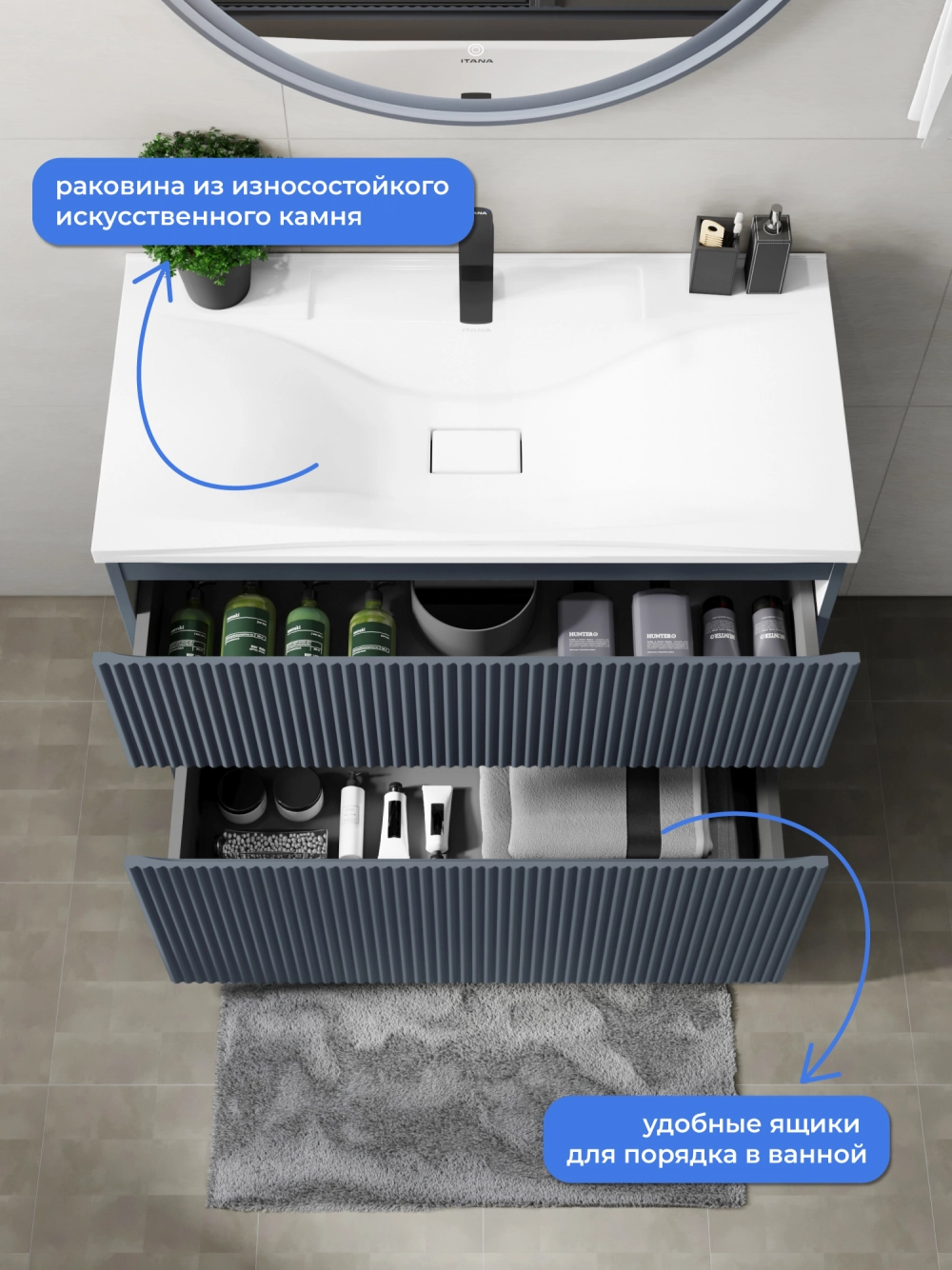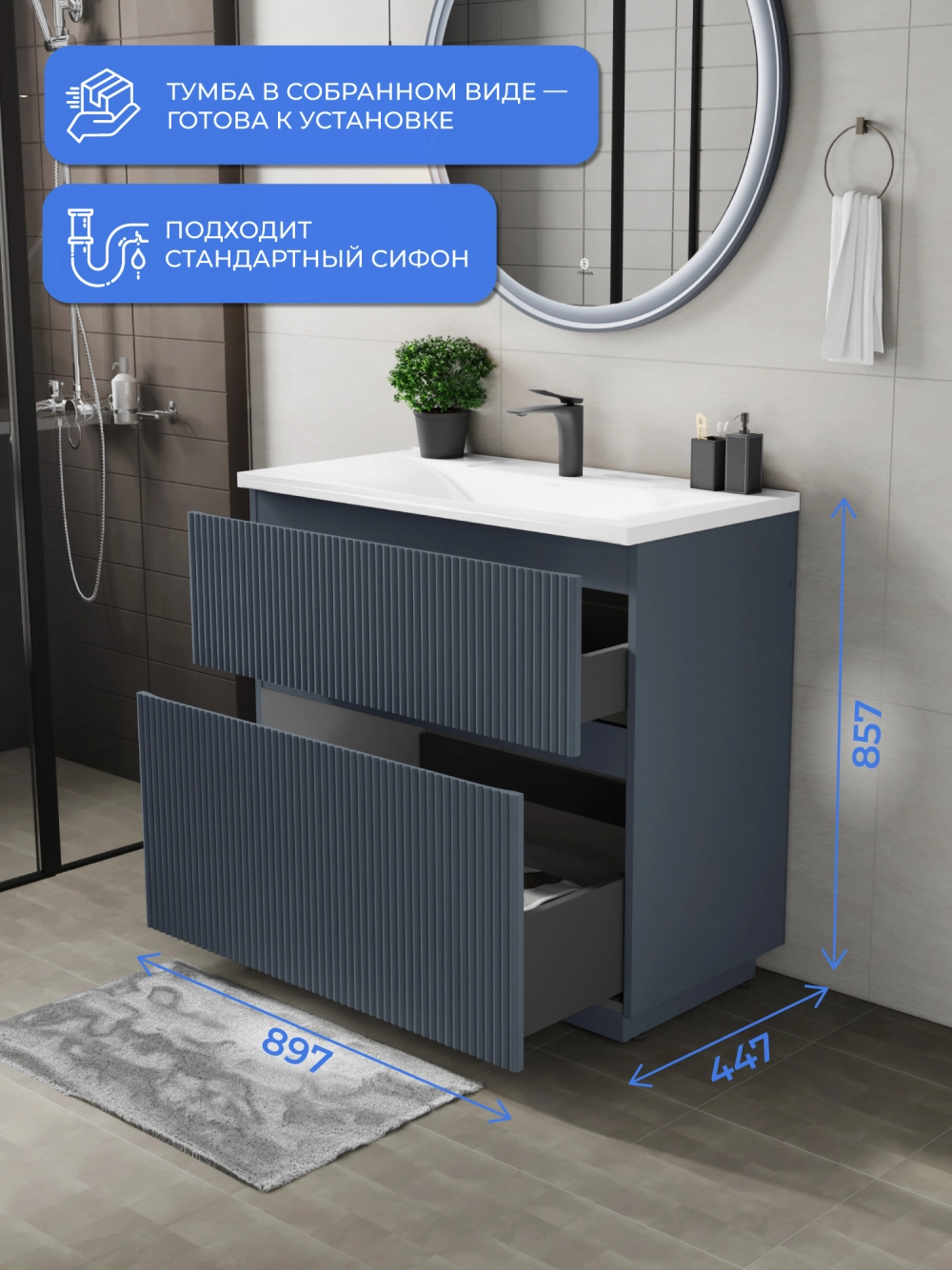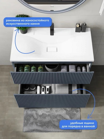 Напольная тумба с раковиной Итана Kate станет идеальным дополнением для вашей ванной комнаты, сочетая в себе стильный дизайн и функциональность. Коллекция Kate - воплотила в себе тренд на фактурные фасады. Идеальный "рубчик" - простое и стильное дизайнерское решение для декорирования фасадов - эта мебель бесспорно станет украшением современной ванной комнаты. Тумба изготовлена из высококачественных материалов, гарантируя долговечность и надежность эксплуатации. Удобные фрезерованные ручки, качественная фурнитура с доводчиками, вместительность - мы продумали все, чтобы тумба была не просто красивой, но еще и функциональной, приятной в использовании. Ее конструкция позволяет легко поддерживать порядок в ванной, ведь все мелочи будут аккуратно убраны. Раковина выполнена из искусственного камня, обладает устойчивостью к механическим повреждениям и влиянию химических средств. Стильный декор тумбы с раковиной добавляет изюминку в общий дизайн, вписываясь в современные и классические интерьеры. Удобные выдвижные ящики обеспечивают простоту доступа к содержимому тумбы. Безупречное сочетание раковины с тумбой подчеркивает общий стиль вашей ванной комнаты, делая ее уютной и функциональной.
