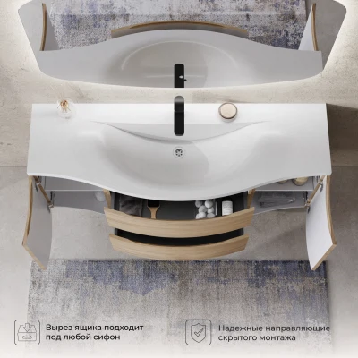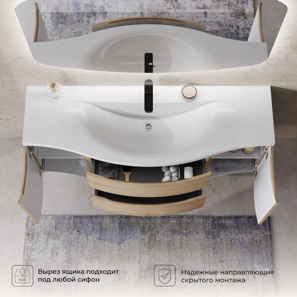 Подвесная тумба с раковиной Итана Arko 140 станет не только стильным акцентом для вашей ванной комнаты. Эстетически привлекательный дизайн с радиусными фасадами подчеркивает современный стиль интерьера. Благодаря подвесной конструкции, такая мебель значительно упрощает уборку, обеспечивая легкий доступ к полу. Тумба с раковиной в ванную изготовлена из высококачественных материалов, что гарантирует долгий срок службы и сохранность внешнего вида на протяжении многих лет. Продуманное до мелочей исполнение фасадов, мягкость линий и современный дизайн делают её отличным дополнением к любой ванной комнате. Качественная фурнитура с доводчиками обеспечивает легкое открывание и плавное закрывание ящиков. Тумба с раковиной с ящиками, где можно рационально распределить и разместить все необходимые вещи для ванной комнаты. Для точного выбора тумбы рекомендуем обратиться к схеме замеров, которая находится на фото в карточке товара. Размеры изделия могут отличаться +/-1 см в связи со спецификой производства. Подвесная тумба с раковиной приходит в надежной упаковке и в собранном виде.