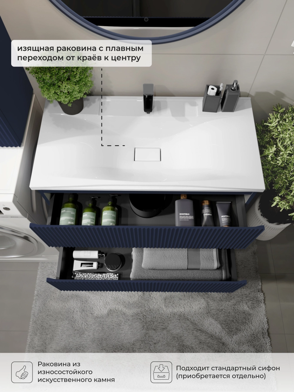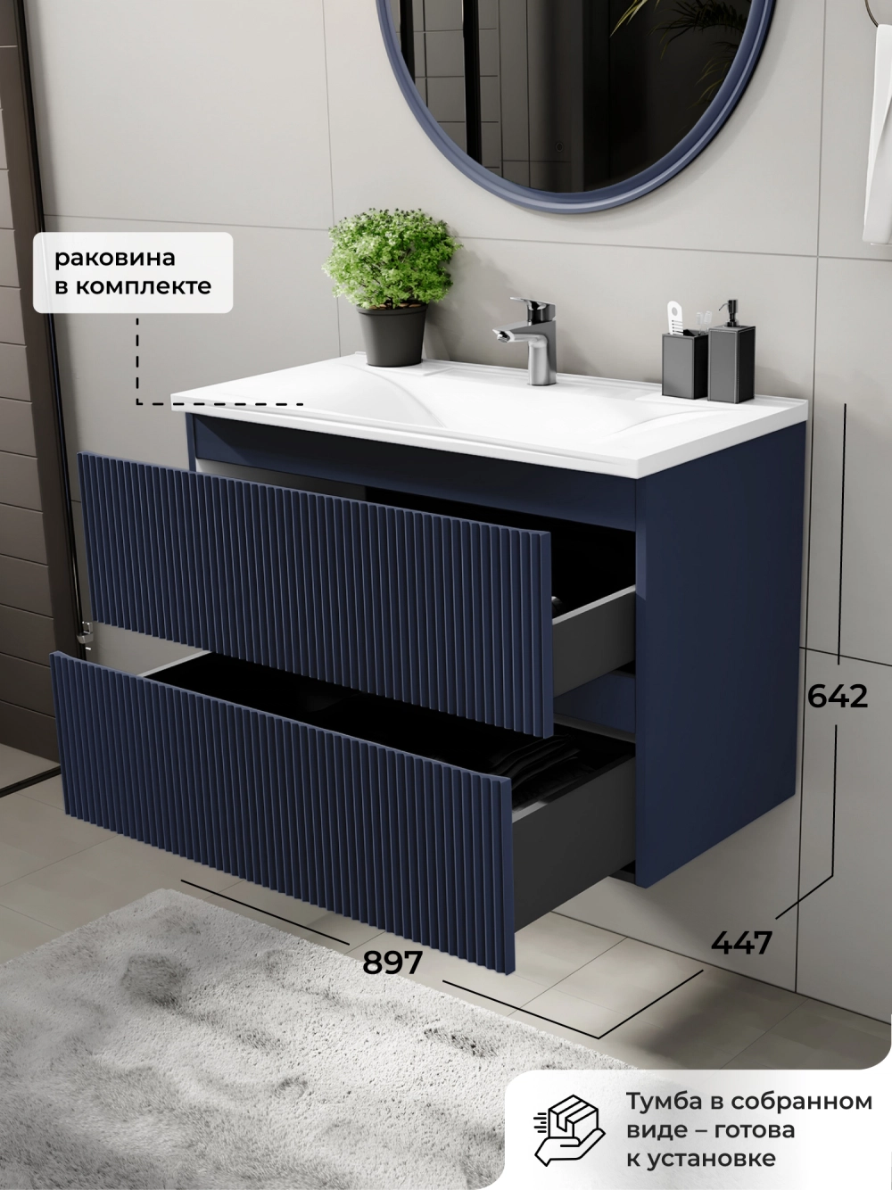 Подвесная тумба с раковиной из коллекции Kate станет настоящим украшением ванной комнаты в современном стиле. Навесной способ установки тумбы в ванную дает возможность не только визуально увеличить пространство, но и обеспечивает быстрый и удобный доступ для уборки. Размеры подвесной тумбы с раковиной 897*447*642 - идеальный выбор для ванной комнаты или туалета. Тумба для ванны изготовлена из МДФ и покрыта ПВХ пленкой, поэтому выдерживает высокие эксплуатационные нагрузки. Качественная фурнитура с доводчиками обеспечивает легкое открывание и плавное закрывание ящиков. Вырез под сифон универсальный, для любого типа. Благодаря своей конструкции тумба обеспечивает удобный доступ к раковине и позволяет скрыть коммуникации. Тумба с раковиной в ванную оснащена двумя удобными ящиками для хранения, что позволяет разместить всё необходимое под рукой. Раковина из искусственого камня– это безупречная гладкость поверхности, на которой не задерживаются загрязнения. Для точного выбора тумбы с раковиной в ванную комнату рекомендуем обратиться к схеме замеров, которая находится на фото в карточке товара, размеры изделия могут отличаться +/-1 см в связи со спецификой производства. Тумба для ванной доставляется в предварительно собранном виде, надежно упакована.