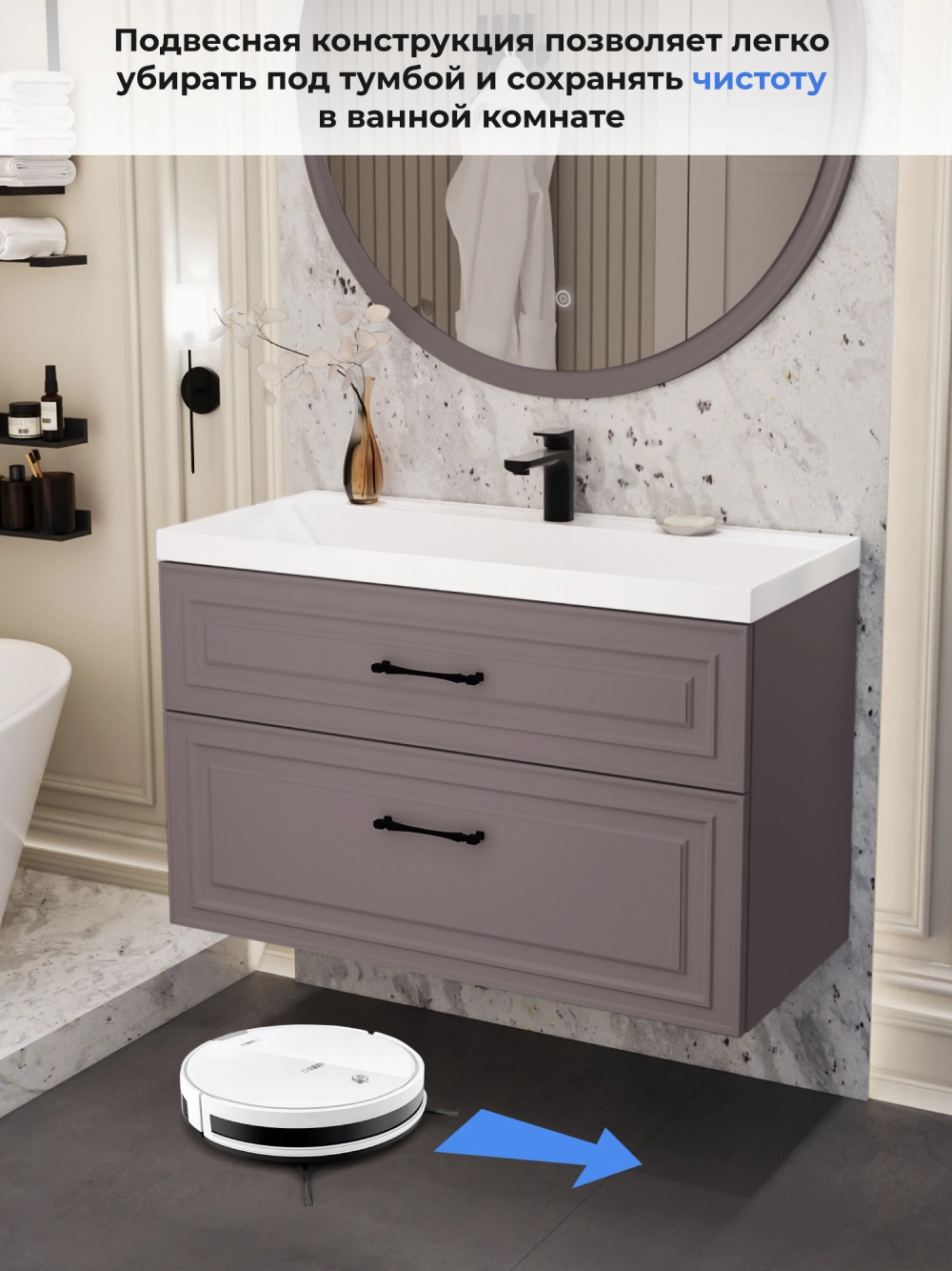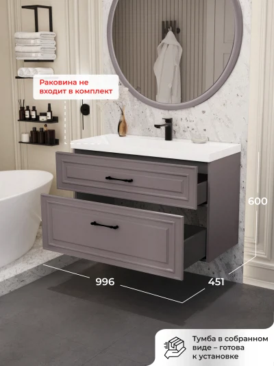 Подвесная тумба под раковину из коллекции Verona станет настоящим украшением ванной комнаты в современном скандинавском стиле. Навесной способ установки тумбы в ванную дает возможность не только визуально увеличить пространство, но и обеспечивает быстрый и удобный доступ для уборки. Размеры подвесной тумбы под раковину 996х451х600 - идеальный выбор для ванной комнаты или туалета. Тумба для ванны изготовлена из прочного МДФ, поэтому выдерживает высокие эксплуатационные нагрузки. Качественная фурнитура с доводчиками обеспечивает легкое открывание и плавное закрывание ящика. Вырез под сифон универсальный, для любого типа. Благодаря своей конструкции тумба в ванную обеспечивает удобный доступ к раковине и позволяет скрыть коммуникации. Тумба под раковину в ванную оснащена удобным ящиком для хранения, что позволяет разместить всё необходимое под рукой. Ручки интегрированы в фасад дверки шкафчика, что исключает возможность случайного удара о фурнитуру. Для точного выбора подвесной тумбы под раковину в ванную комнату рекомендуем обратиться к схеме замеров, которая находится на фото в карточке товара, размеры изделия могут отличаться +/-1 см в связи со спецификой производства. Тумба для ванной доставляется в предварительно собранном виде, надежно упакована.